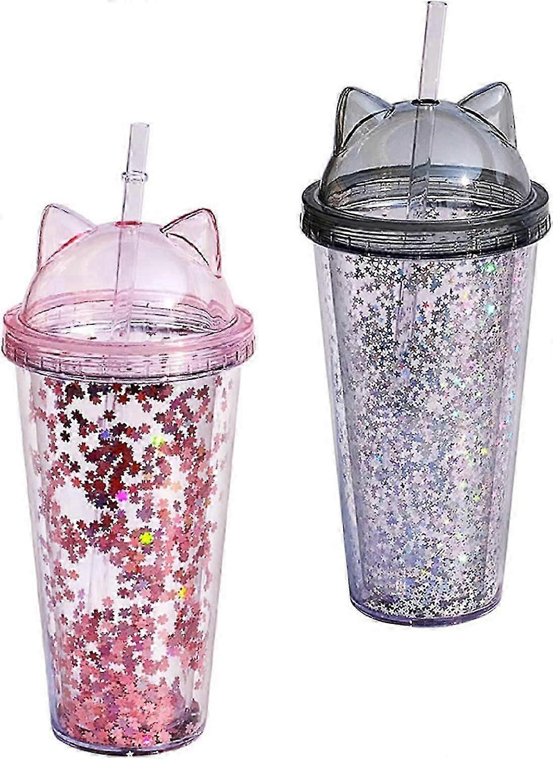 2Pcs Water Bottles for Girls, Double Layer Glitter Water Bottle with Straw, Cute Water Bottle with Cat Ear Lid for Outdoor Use