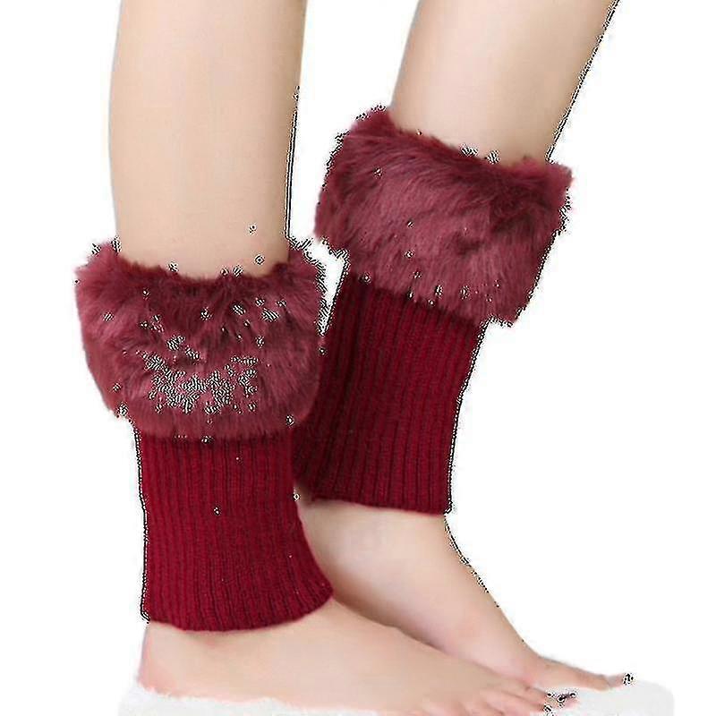Women Crochet Knit Faux Fur Trim Leg Warmers Short Furry Fuzzy Leg Cuffs Foot Cover Leg Sleeve Boot Socks Wine Red