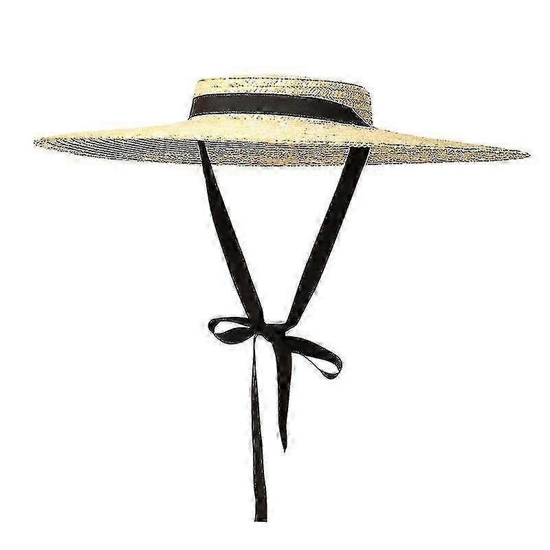 Vintage Large Brim Straw Hat For Women Flat Top Summer Beach Cap Shallow Crown Boater Sun Hats Ribbon Tie Wicker Hat
