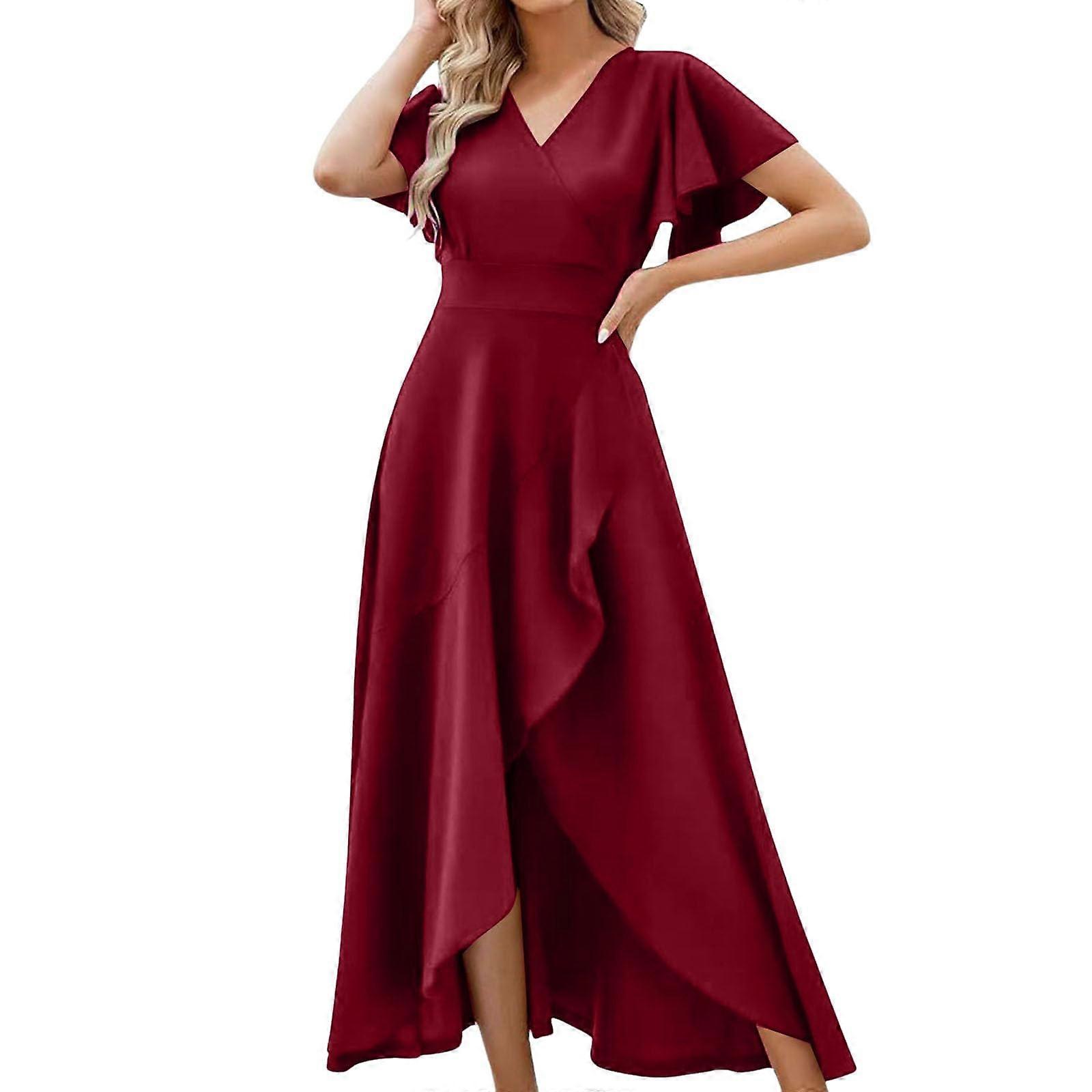 Elegant Pleated V-Neck Cocktail Dress for Women, Stylish Evening Dress in Red for Wedding Guests, Size L