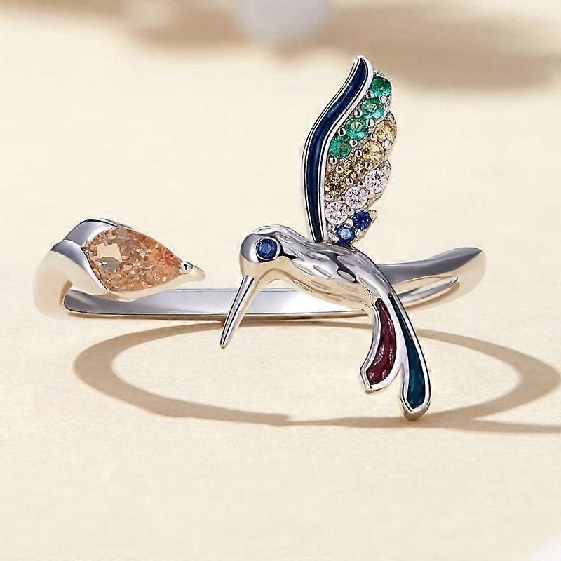 Adjustable Silver Color Hummingbird Ring with Colorful Zirconia for Women Wedding Jewelry Party Birthday Gift Vintage Style