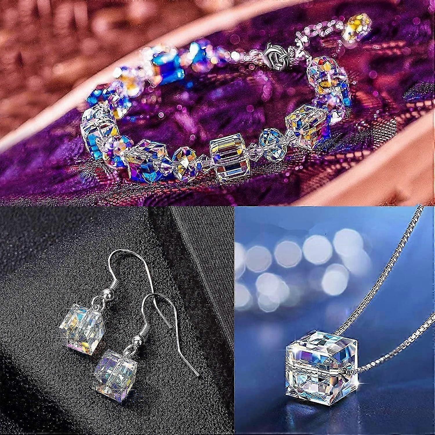 Crystal Jewelry Sets for Women, Austrians Sugar Cube Crystal Necklace Bracelet Pendant Earrings 3-Piece Set for Date, Party, Wedding, Anniversary, Bir
