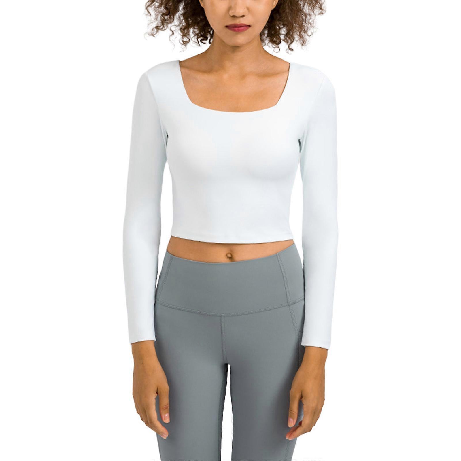 Crop Tops for Women Square Neck Long Sleeve Shirts Stretchy Workout Exercise Tops Casual Slim Fitted Shirt Built in Bra White 8