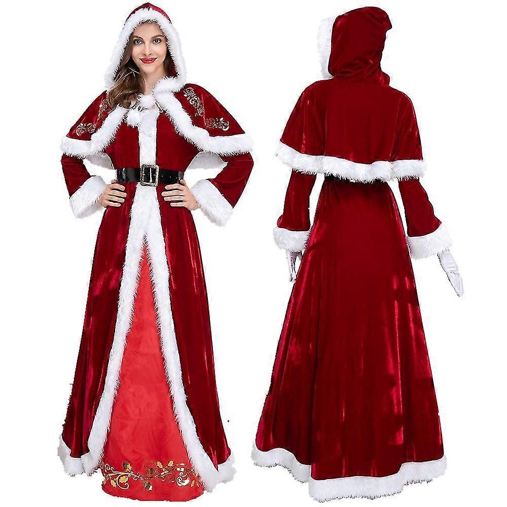 Mrs Santa Claus Costume For Women Velvet Hooded Dress Long Sleeve Christmas Clothes
