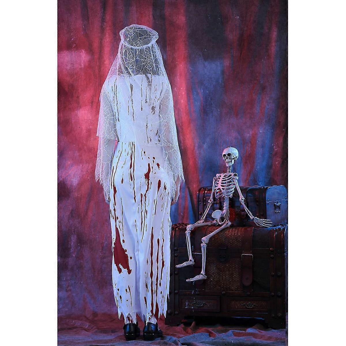 Halloween Costume for Women Dead Bride Long Dress with Veil Ghostly Style Cosplay Party Wear 2Pcs