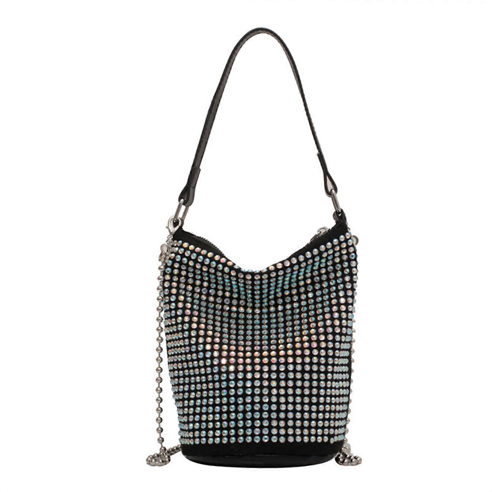 Features 1. MATERIAL: It is made of soft micro suede outer lining with solid shining Rhinestones, durable polyester inner lining, durable faux leather bottom and sturdy leather handle for easy carrying, smooth metal zipper, and nicely made detachable silver chain for crossbody strap. 2. SPACIOUS STORAGE SPACE: Small size classy chic Tote Bag is perfect to hold a range of stuffs such as phone, wallet, car keys, glasses, lipsticks, makeups, tissue, notebook, or other personal belongs, which is a nice lightweight, quality, portable and durable daily bag. 3. MULTI-STYLES BUCKET BAG: Rhinestone Bucket Hobo Handbag can be used as leisure packages, fashionable female bag, sell like hot cakes female bags, etc; normally has best performances in these three styles: small portable underarm bag for fashion girls, trendy cool crossbody bag for punk Youngs, and shiny luxury evening handbag for elegant ladies. 4. SIZE: Small tote bag exquisite sized 7.87 inch in length, and 5 inch thick. The tote bag is sparkling shine, eye-catching, soft, lightweight and durable. With its all-match style and quality, you can use it in any occasions however you want. 5. OCCASIONS: Suitable for formal events or casual gatherings, wedding parties, appointments. Evening clutch bags are also very suitable for daily carrying, shopping and work. It is also the best gift for female friends around me. Specification Material: PU, Polyester Color: Black, Silver, Multicolor Size: 20 20 Weight: 300 g Package Include: 1 Rhinestone Purse