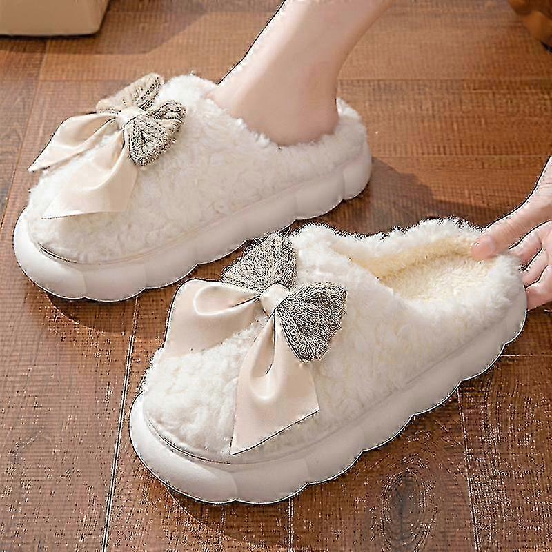 Winter Warm Fur Slippers for Women Cute bow House Non Slip Soft Shoes Comfort Flat Heel Home Indoor Bedroom Plush Slippers