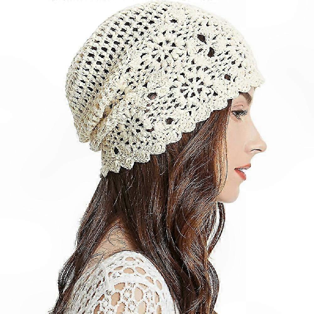 Summer Floral Knit Cotton Beanie for Women Handmade Crochet Slouchy Skull Cap