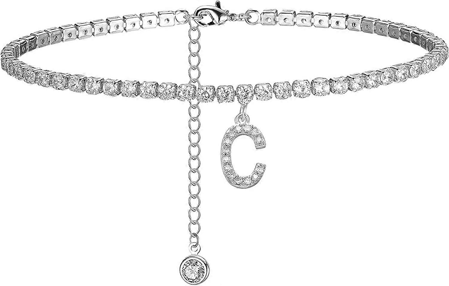 Initial Ankle Bracelets for Women, White Gold Plated Dainty Tennis Chain CZ Letter Anklets Summer Jewelry Gifts for Women Teen Girls C-silver -