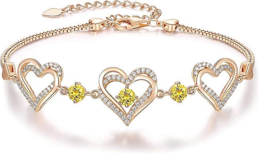 JEWELRY GIFT BIRTHSTONE BRACELET This link chain bracelet is a stylish jewelry gift for mom, grandma, girlfriend, wife, daughter, or friend. Secured with double chains, the interlocking heart bracelet symbolizes love, commitment or friendship for a loved one. Given as a Christmas gift, birthday gift, wedding gift, anniversary gift, graduation gift or Valentine's Day Gift. 925 STERLING SILVER BRACELET The heart link bracelet is made of 925 sterling silver with high-cost rose gold plating. It is suitable for sensitive skins and is not easy to turn your wrist green. The safe materials are hypoallergenic and have oxidation resistance. GEM-QUALITY AAAAA CUBIC ZIRCONIA The birthstone bracelet is inlaid with gem-quality 5A cubic zirconia. 5A cubic zirconia is the highest grade in zirconia, which is elaborately selected from the 3A zirconia, with accurate size and cutting, reflecting the dazzling light like a diamond. THE 12-MONTH BIRTHDAY STONES There are 12 different colors of gemstones, corresponding to the birthstone of each month. You can choose the color according to the birth month. Ruby in July means passion, kindness and dignity. Olivine in August means happiness. Sapphire in September means love, honesty, virtue. Tourmaline in October means joy and peace. Topaz in November means friendship and hope. Tanzanite in December means victory, good luck and success. SIZE & ROMANTIC GIFT Chain Length: 7"+1.97". The heart bracelet comes with an elegant gift box, making it a romantic ladies bracelet for the special women or girl in your life. It is definately a fashion item for any lady's closet.Rose Gold-11-Nov