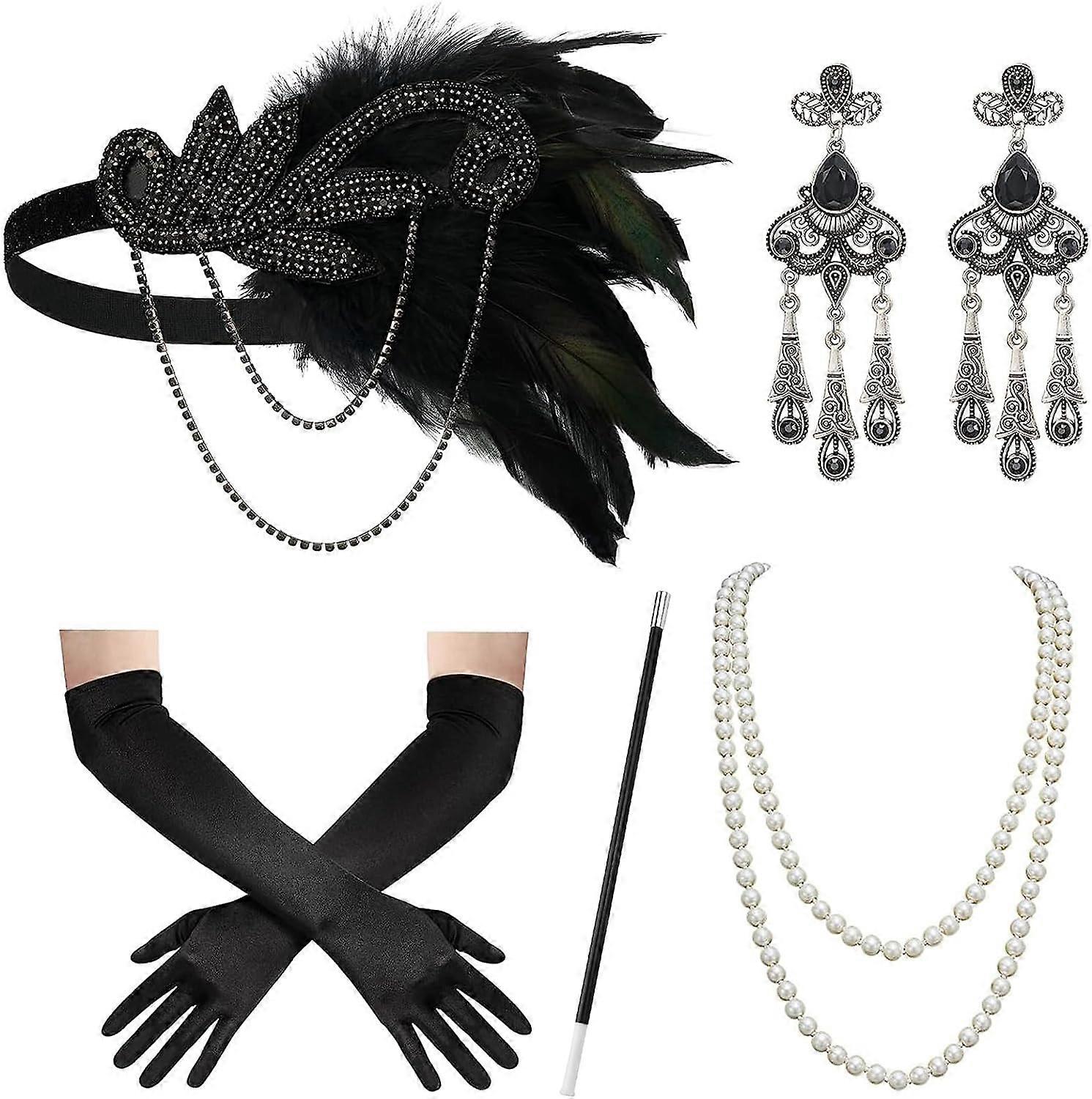 1920s Gatsby Accessories Package Includes:total 5 pieces set including 1 pcs 1920s feathers headband with blinking crystal rhinestones,1 pair dangling earrings,1 pair black long satin glove, 1 pcs white beaded necklace,1 pcs black costume holder.The best clothing accessories of the 1920s will bring you back to the 20s.