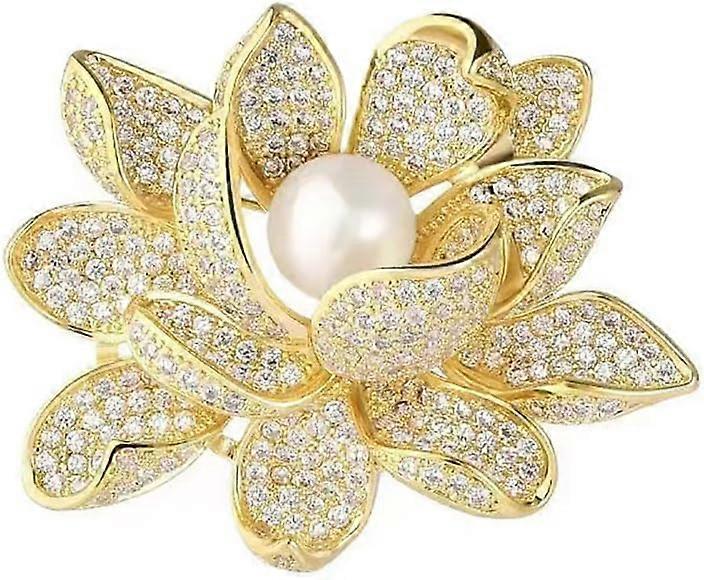 Lotus Flower Brooch Pin for Women Girls Gold Plated Rhinestone CZ Pearl Floral Lapel Pins Corsage Badge Brooches Scarf Clip Pins for Cloth Dress Acces