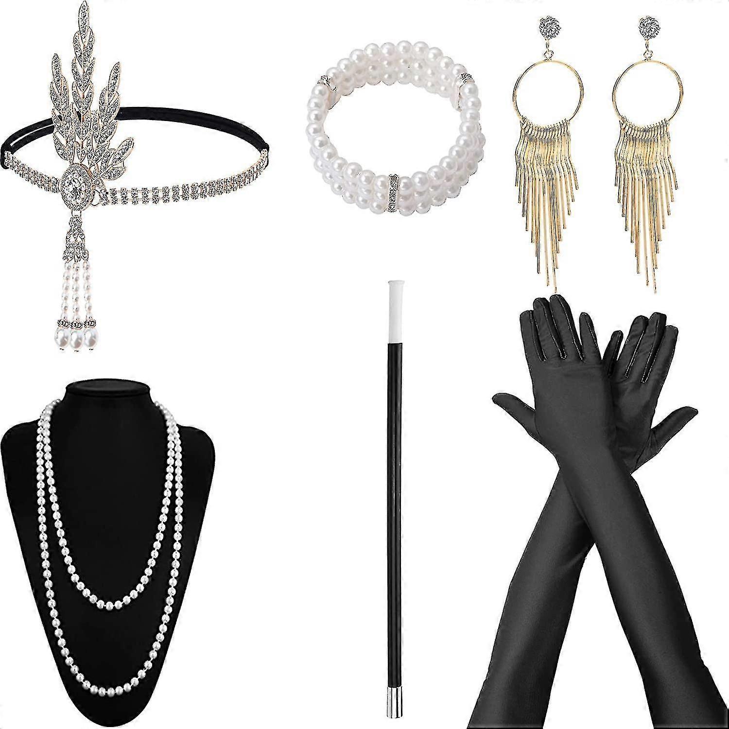 1920s Accessories for Women, Gatsby Accessories Women Set Fashion Roaring 20's Theme Set, 7pcs Headband Long Black Gloves Necklace Earrings for Women