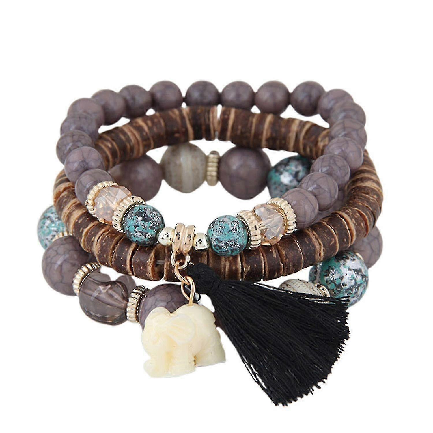 3Pcs Bohemian Elephant Tassel Beaded Bracelets for Women - Elastic Resin Multilayer