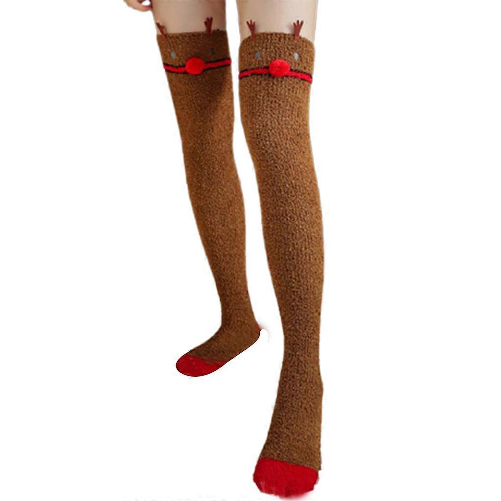 Women Christmas Coral Velvet Thigh High Stockings Cute Santa Claus Elk Pattern Fuzzy Fluffy Plush Home Sleeping Over Knee Long Socks Leg Warmers 2