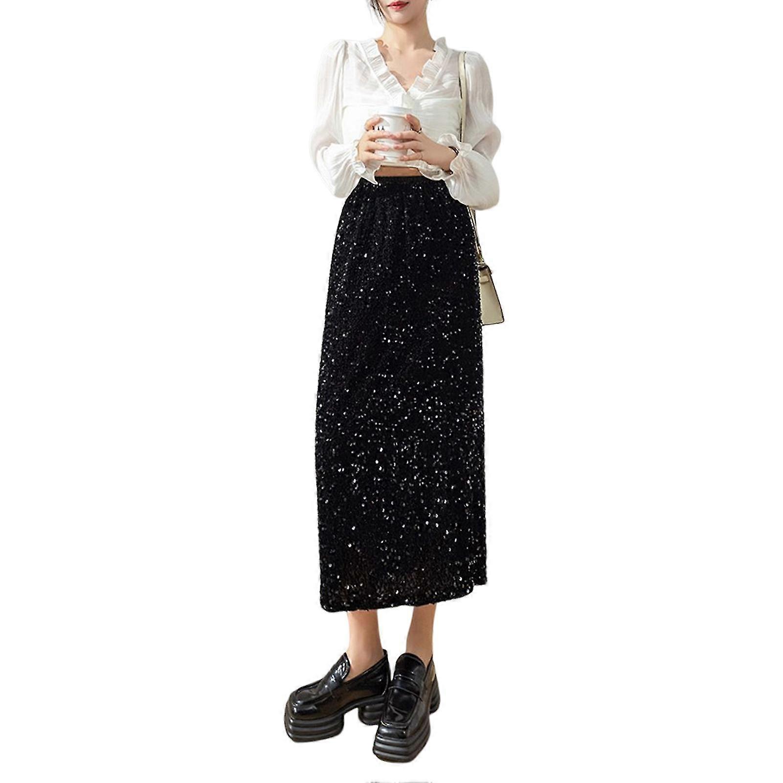 Women\'s Side Split Long Skirts Shiny Glitter Solid Color Elastic Waist Skirts For Work Business Office Club