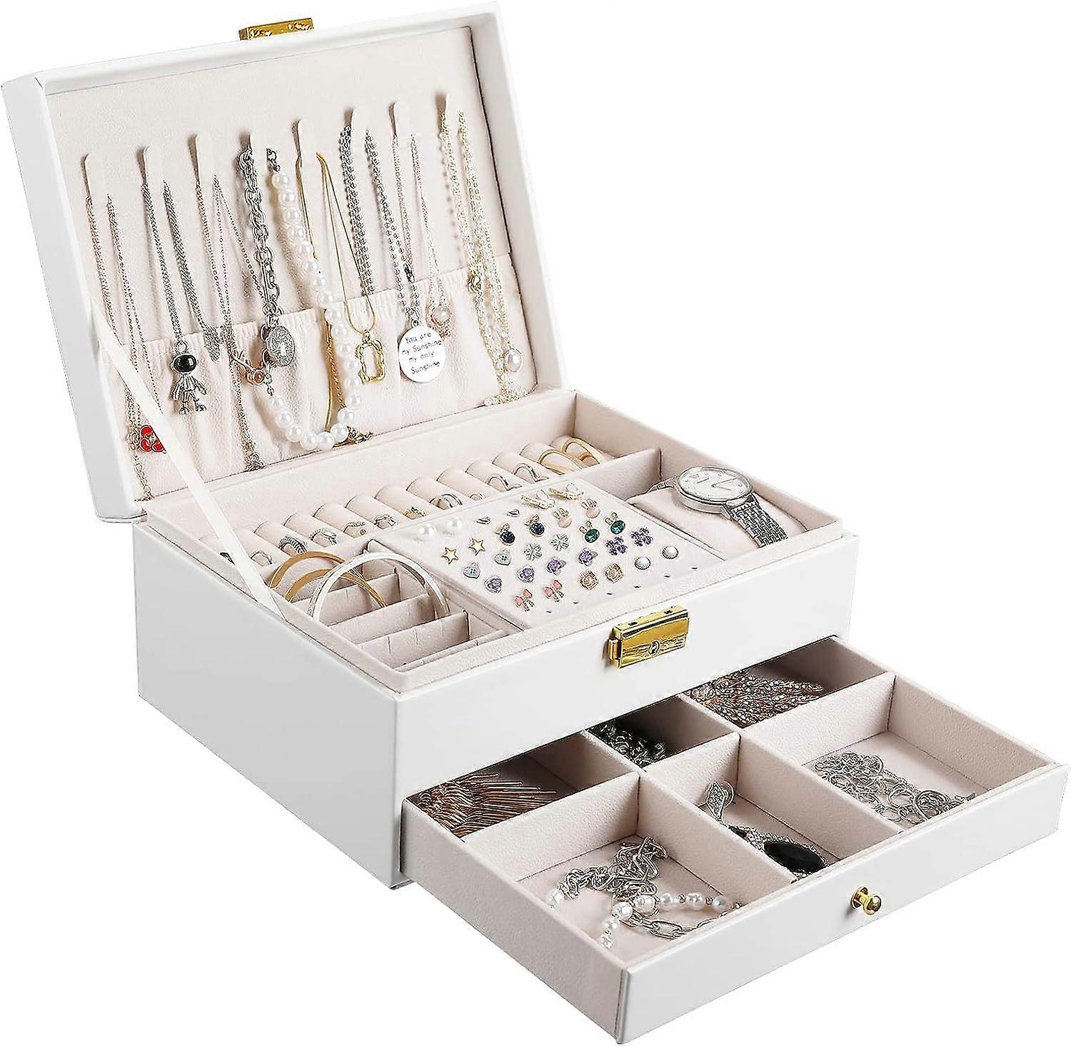 Women's Jewelery Box, 2 Tier PU Leather Travel Jewelery Storage for Girls, Jewelery Organizer and Display Case for Rings, Earrings, Necklaces, Lock an