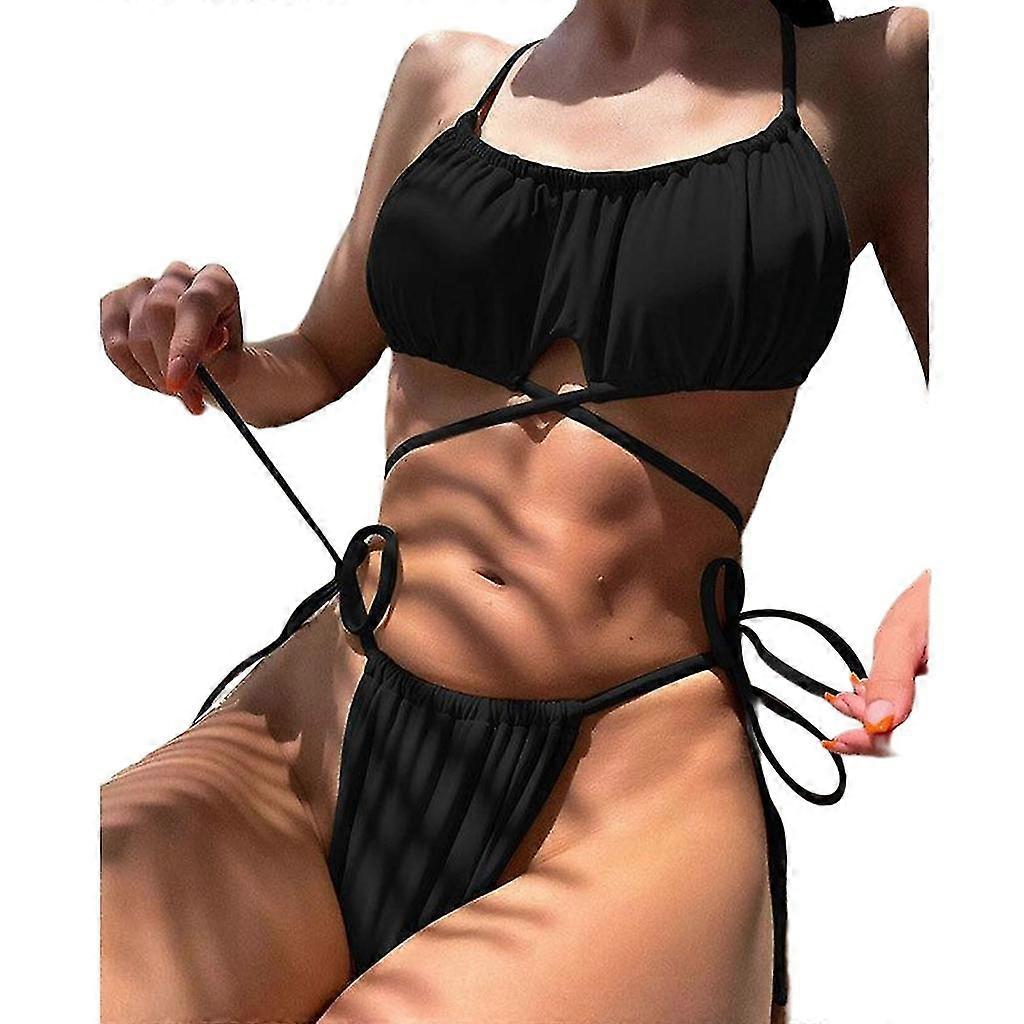 Women Sexy Lacing Bathing Suit Set Thong Beachwear Solid Color Strappy Swimwear
