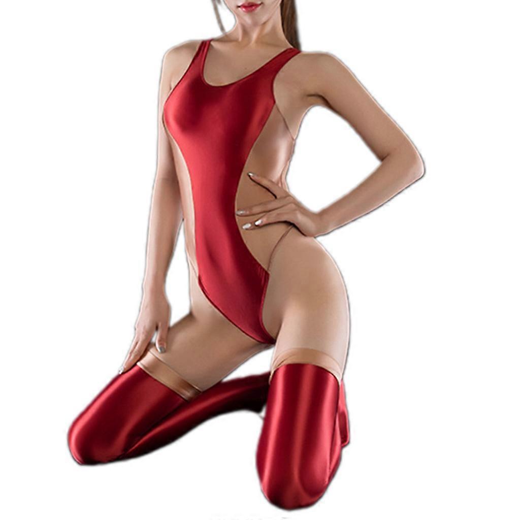 Women Sexy One-Piece Shiny Oil Lingerie Bodysuit with Thigh High Stockings Set Red