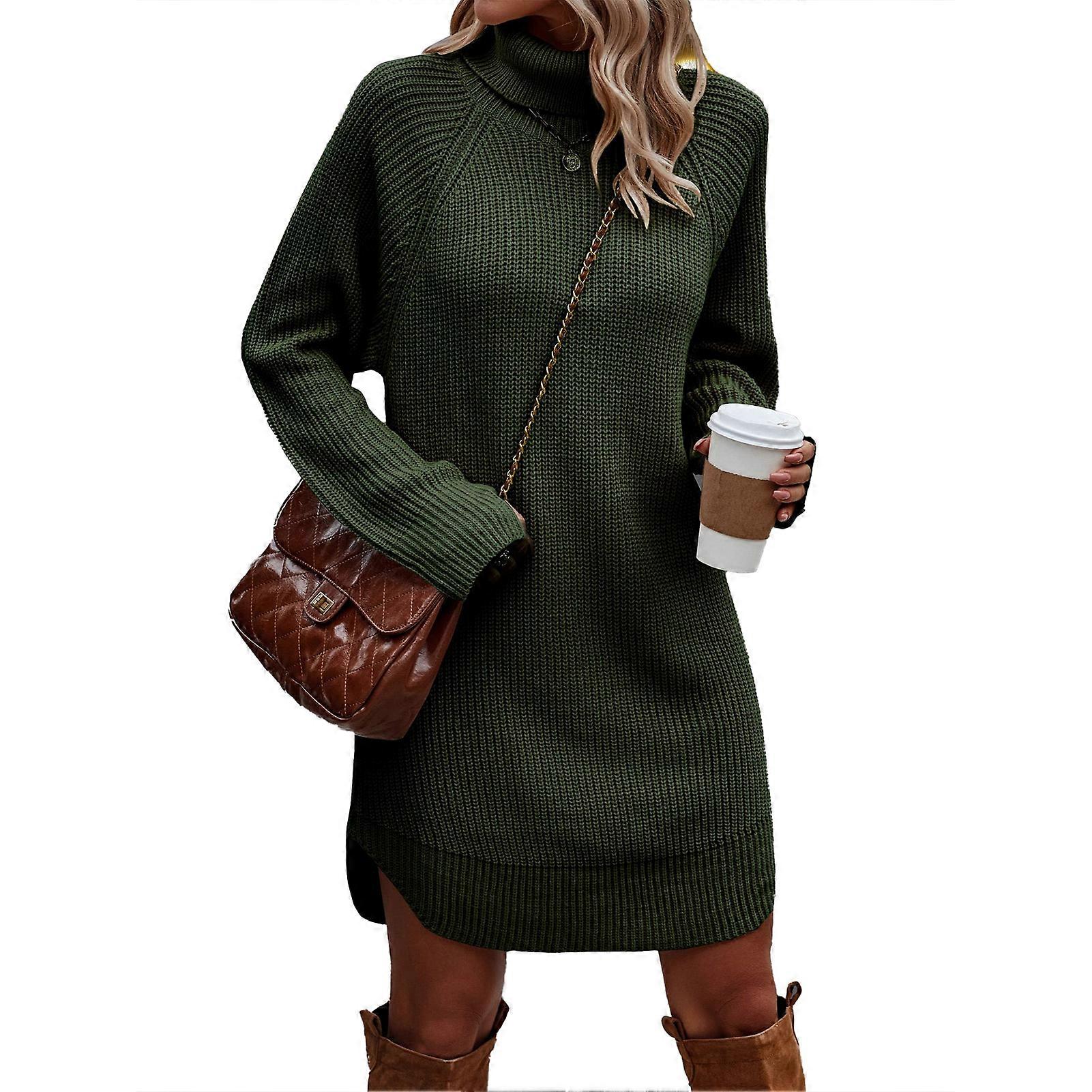 Women Sweater Dress Pure Color High Neck Long Sleeves Knit Dress One Piece for Fall Winter Green S