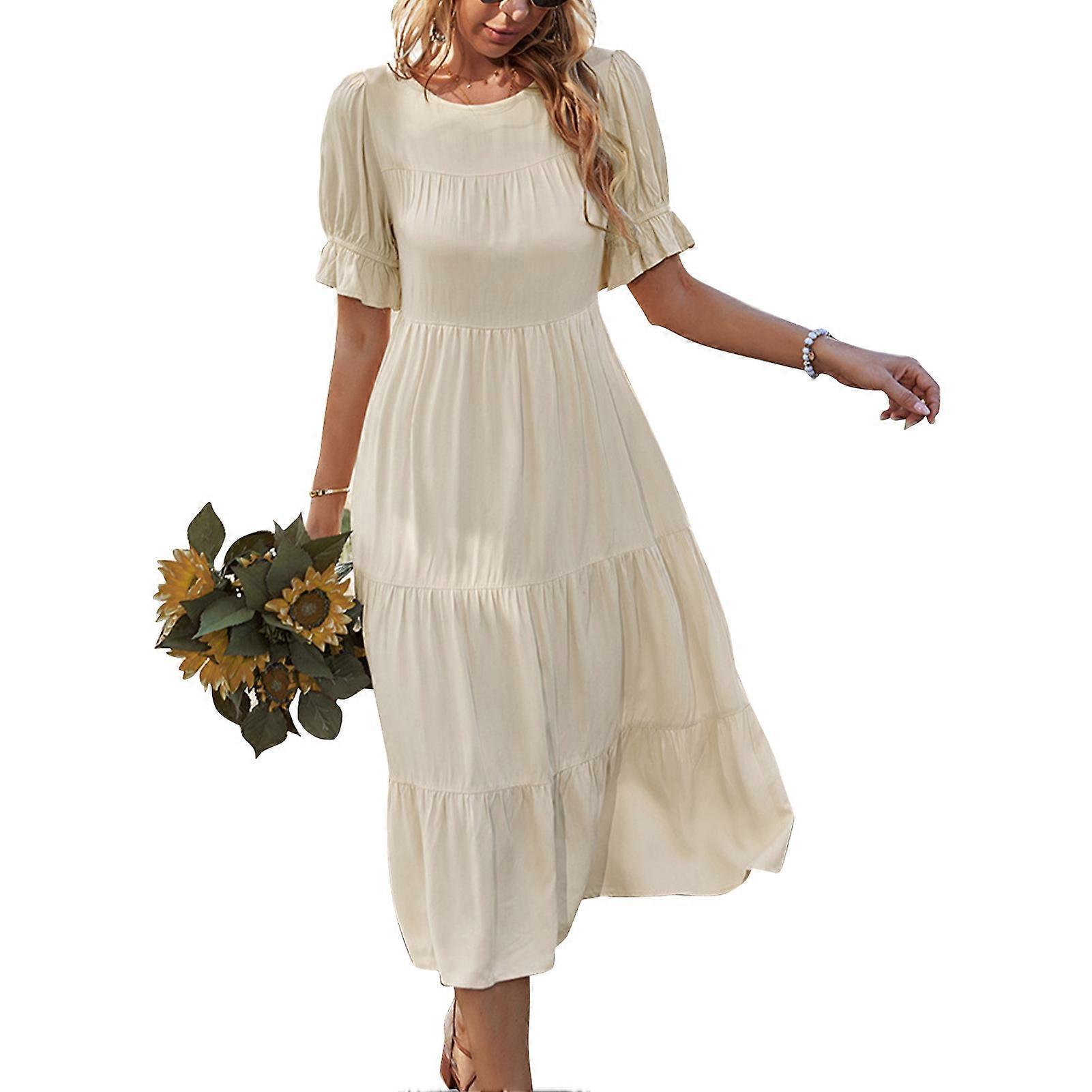 Women Summer Dress Round Collar Ruffle Hem Short Puff Sleeves Loose Type Casual Dress Apricot M