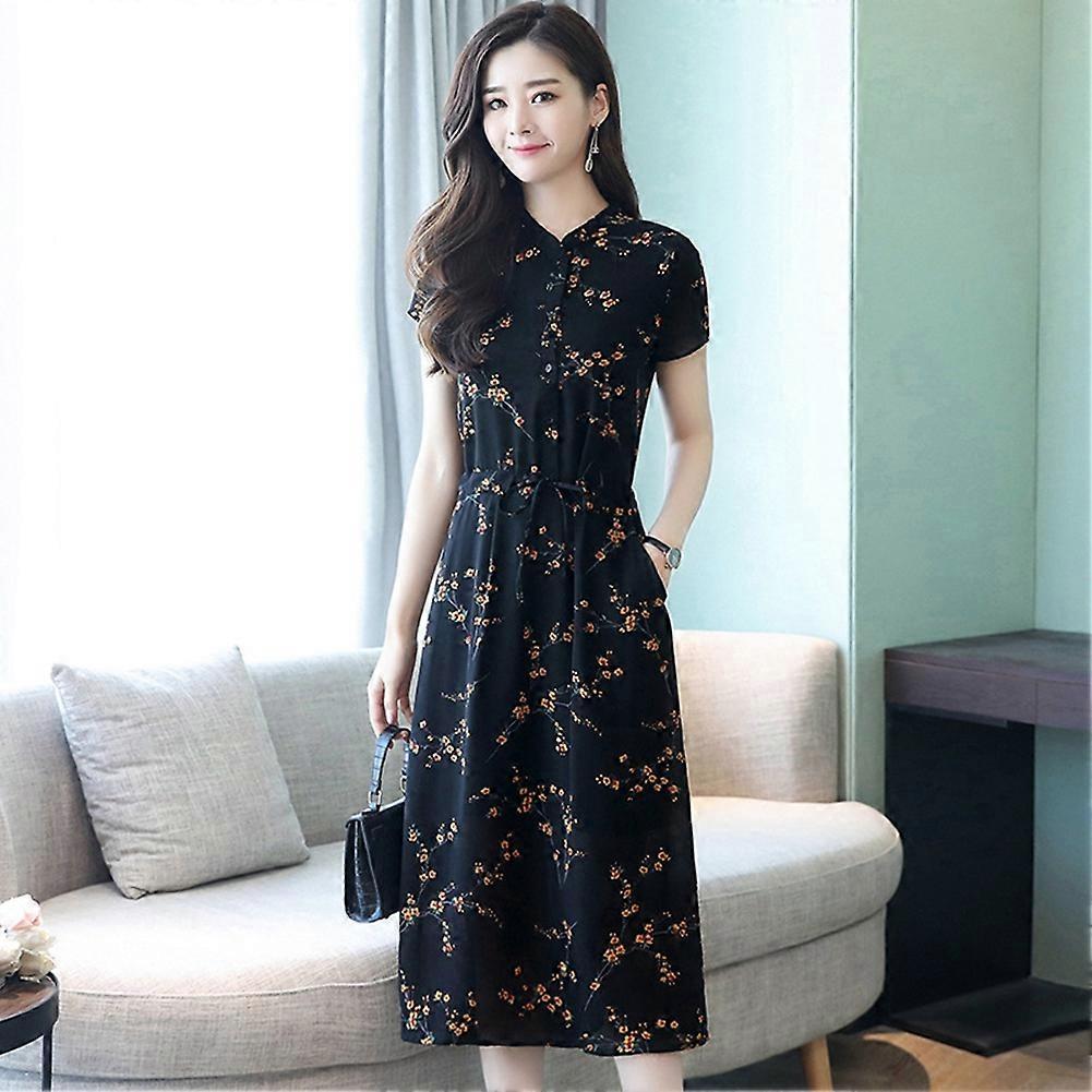 Women Summer Floral Print Long Dress Elegant Slim Waist Drawstring One-piece Dress(2XL)