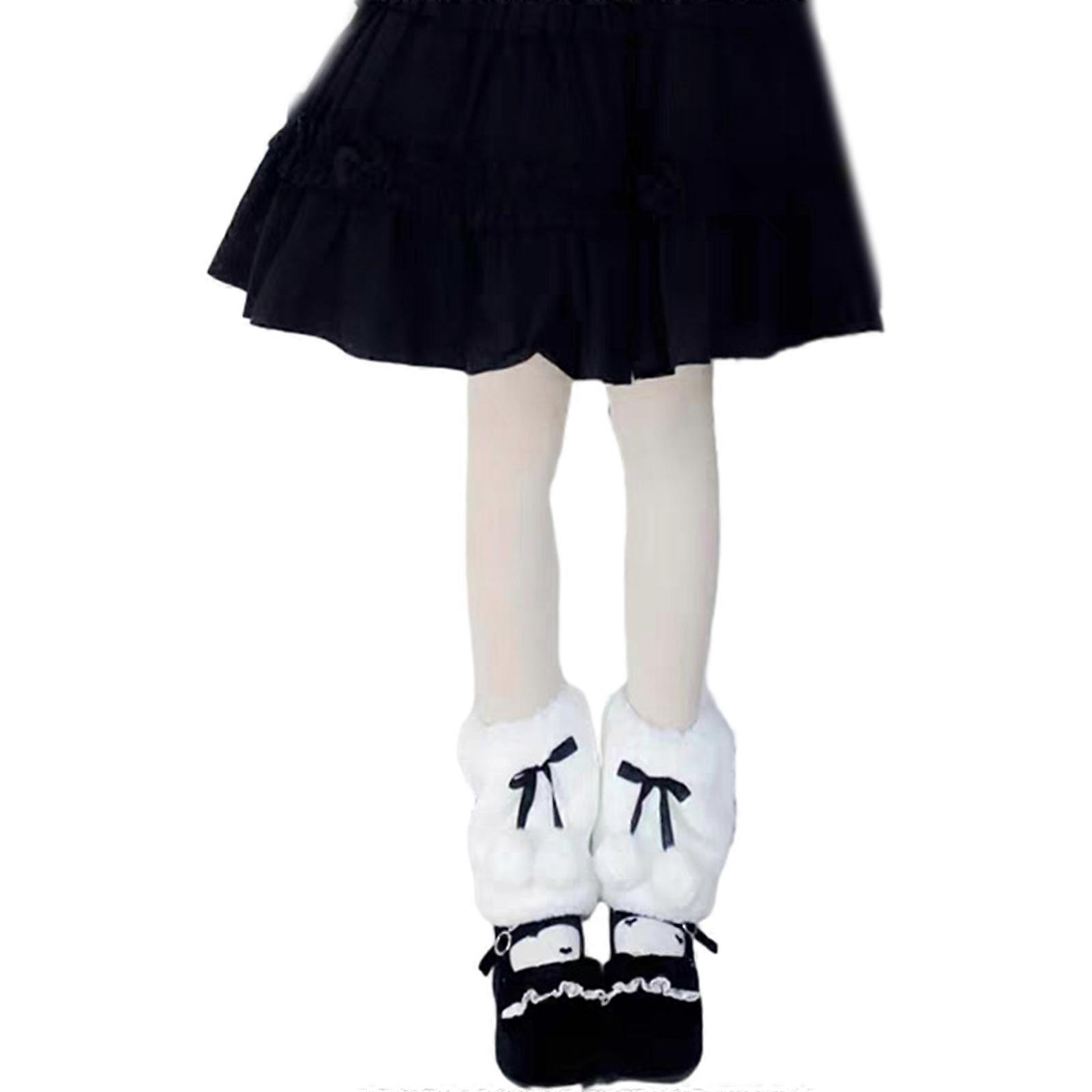Women Girls Winter Thicken Furry Short Leg Warmer Socks Japanese JK Princess Cute Plush Ball Bowknot Boot Cuffs Cover white black bow whit