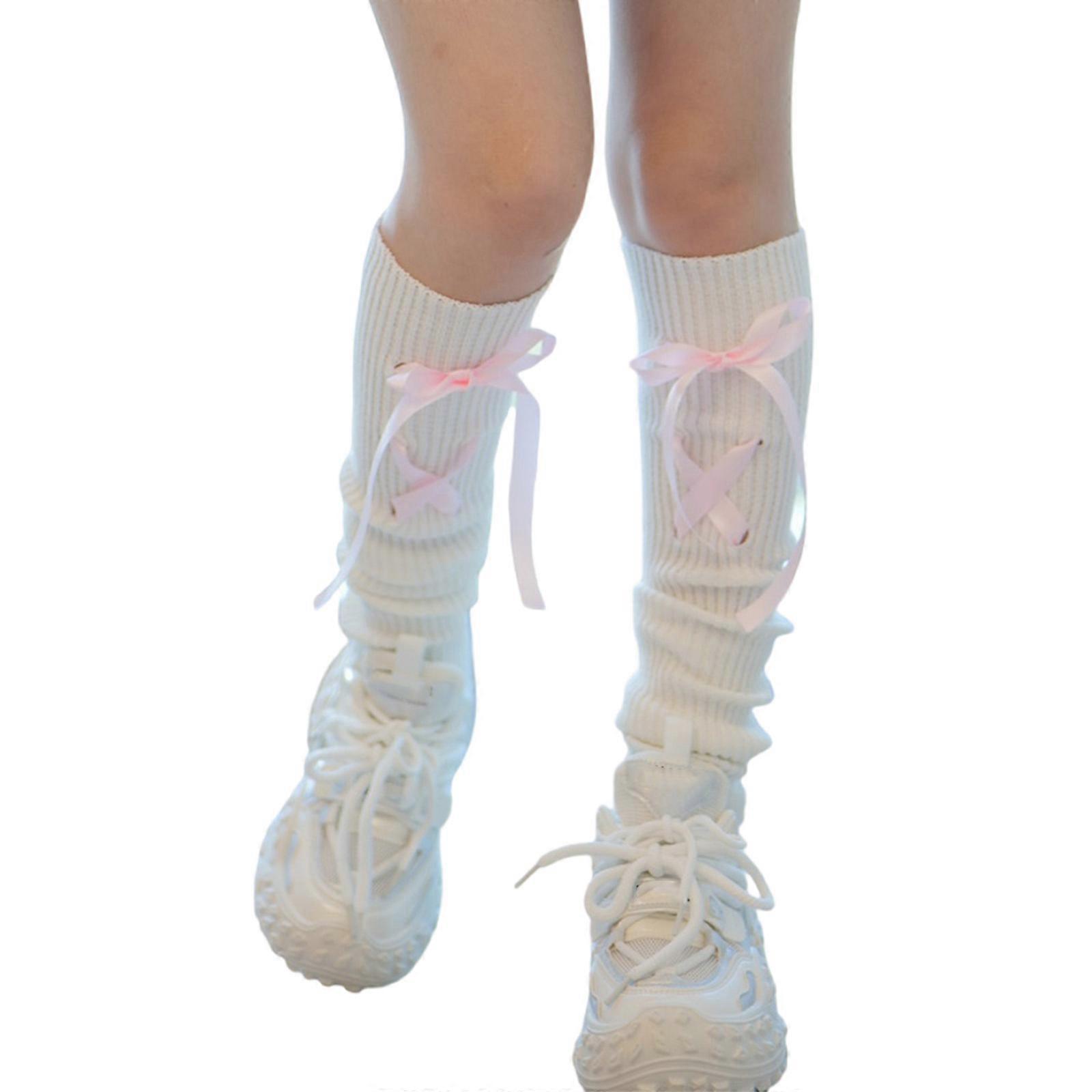 Women Girls Knit Side Double Striped Leg Warmer Aesthetic Elegant Sweet Bowknot Footless Long Socks Sports Leg Covers
