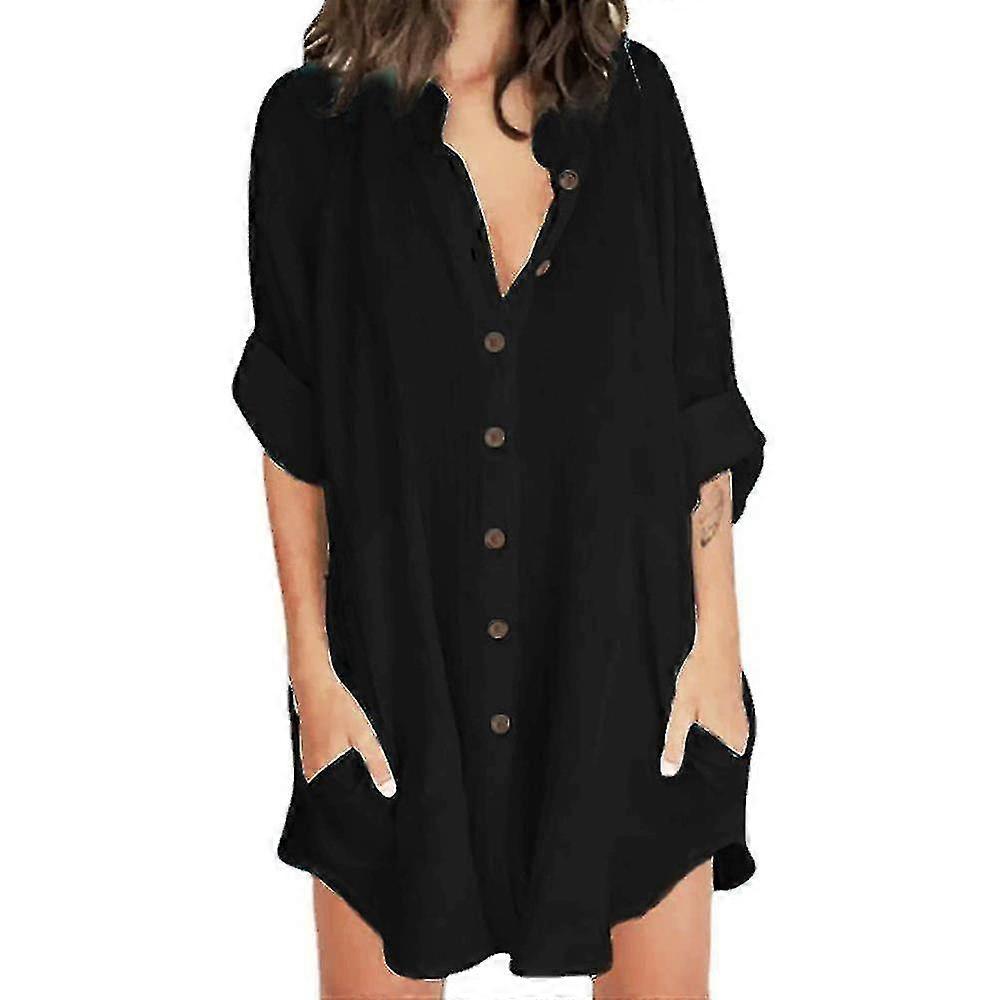 Womens Long Sleeve Button Down Shirt Pockets Solid Oversize Tunic Blouse Tee Tops