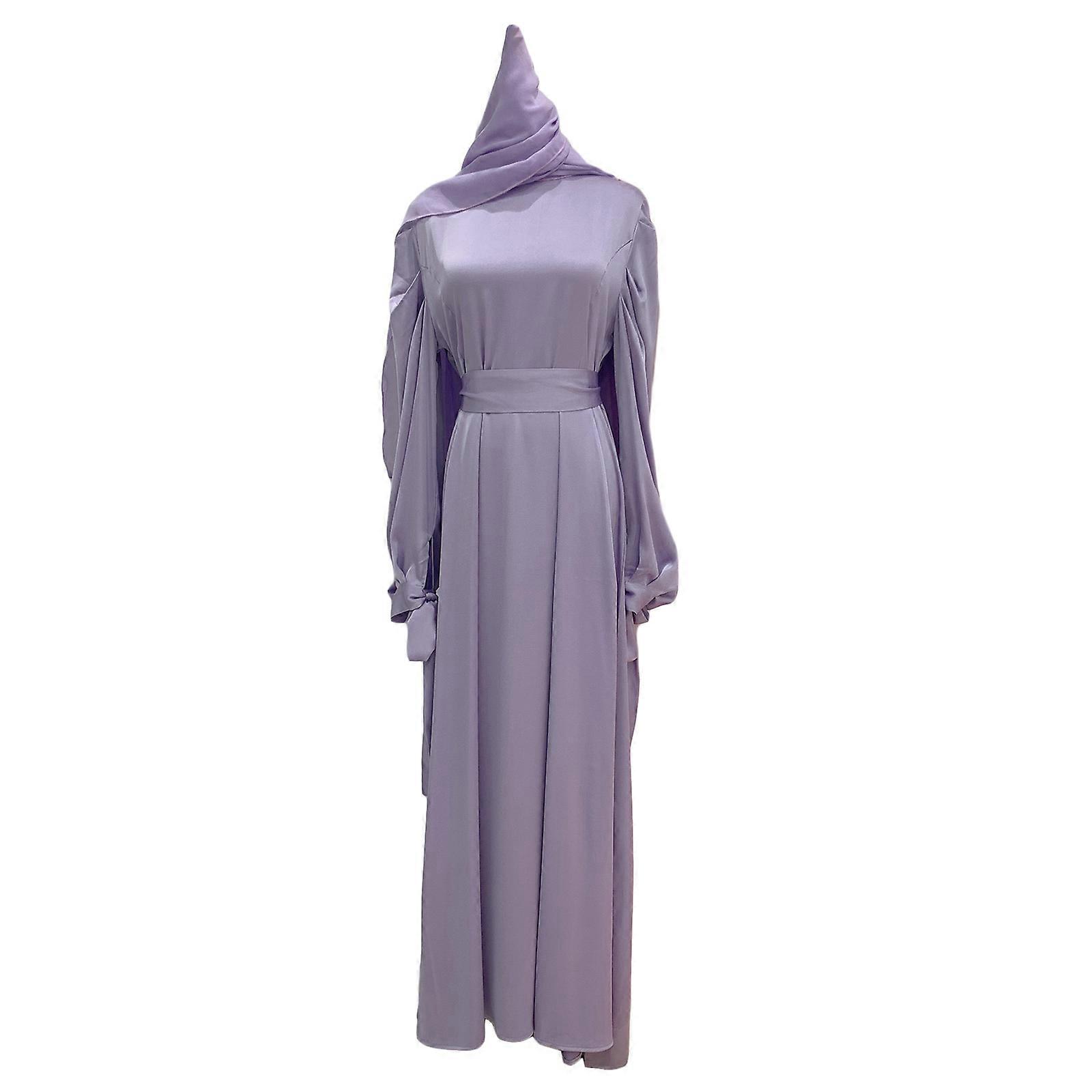 Elegant Empire Waist Long Sleeve Satin Maxi Dress Hijab Dress Middle East Dubai Abaya Turkey Kaftan Islamic Clothing Purple head towel M