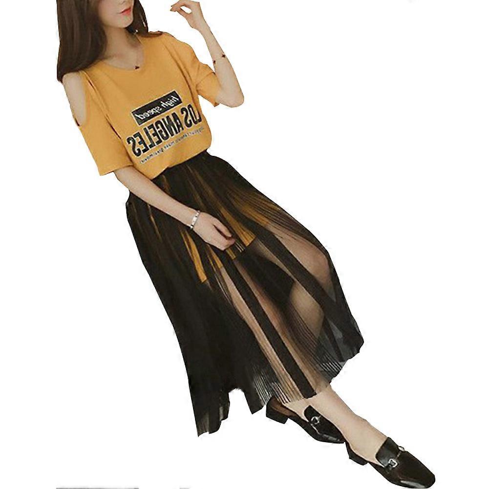 Women Off Shoulder Casual Short Sleeve Letter Print T-shirt Hollow Tulle Skirt Suits(Yellow2XL)