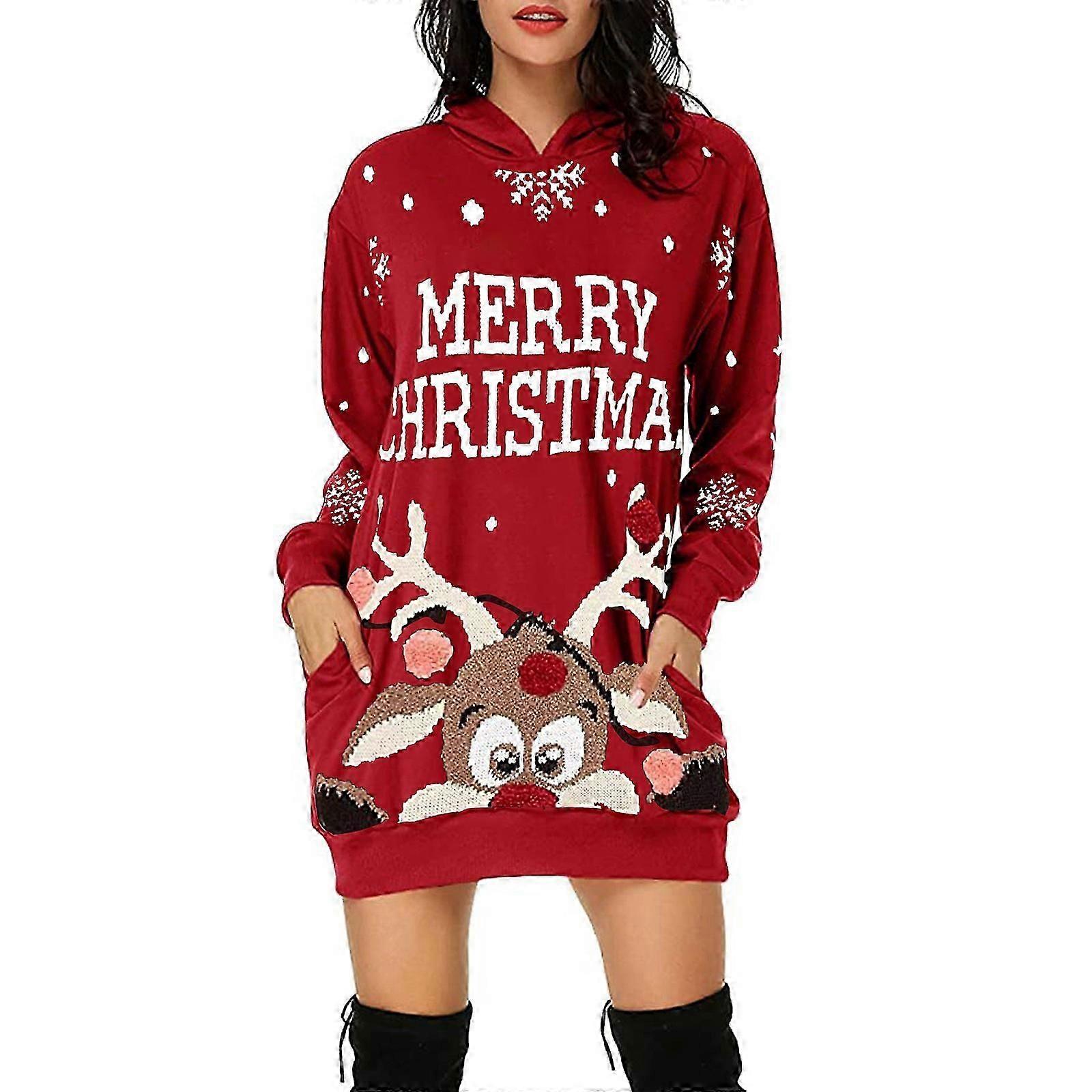 Women Christmas Hooded Dress Reindeer Print Sweater Loose Dress With Pockets