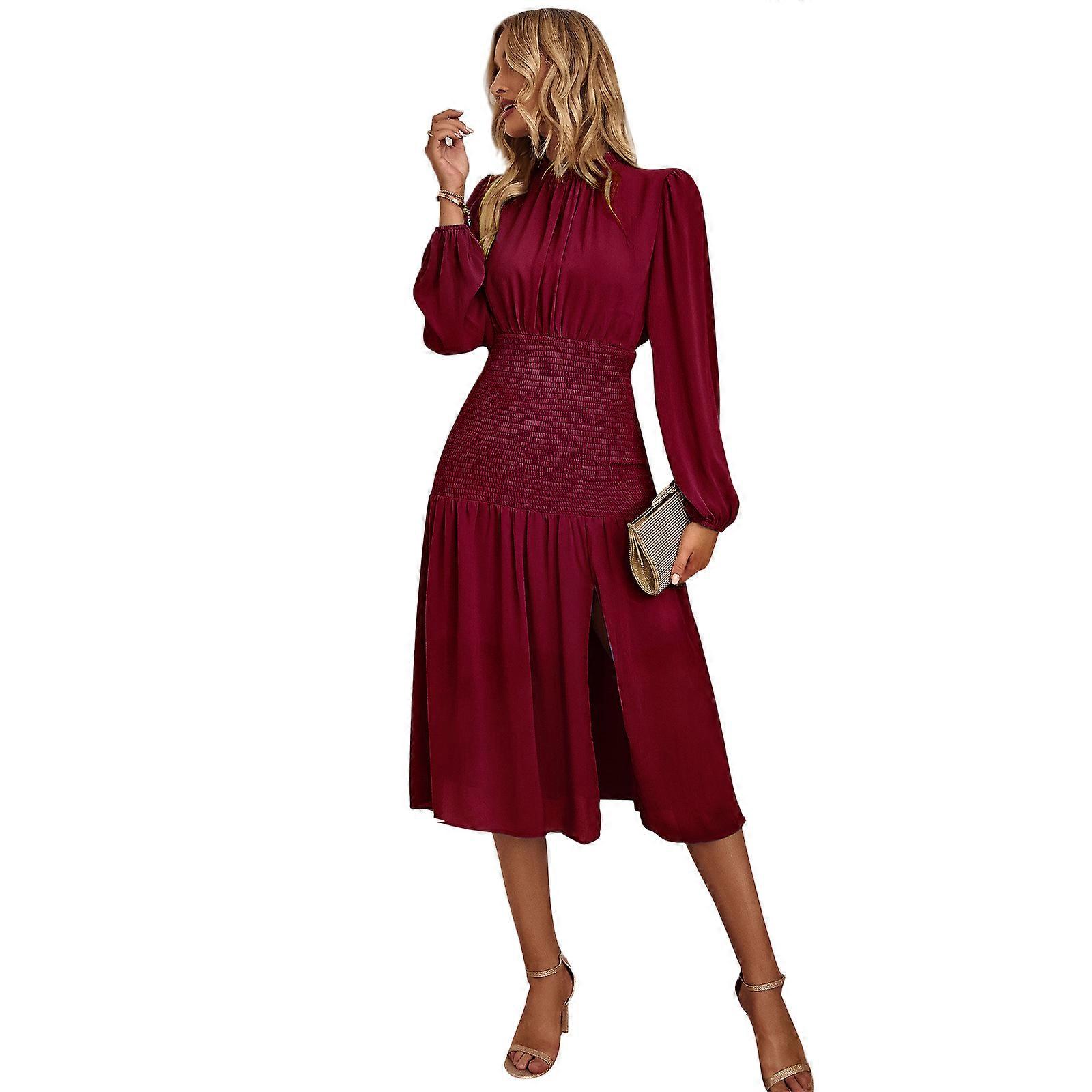 Women Shirred Smocked Elastic Elastic A-Line Midi Dress Ruffled Mock Neck Puff Long Sleeve Solid Color Swing Dresses Burgundy XL