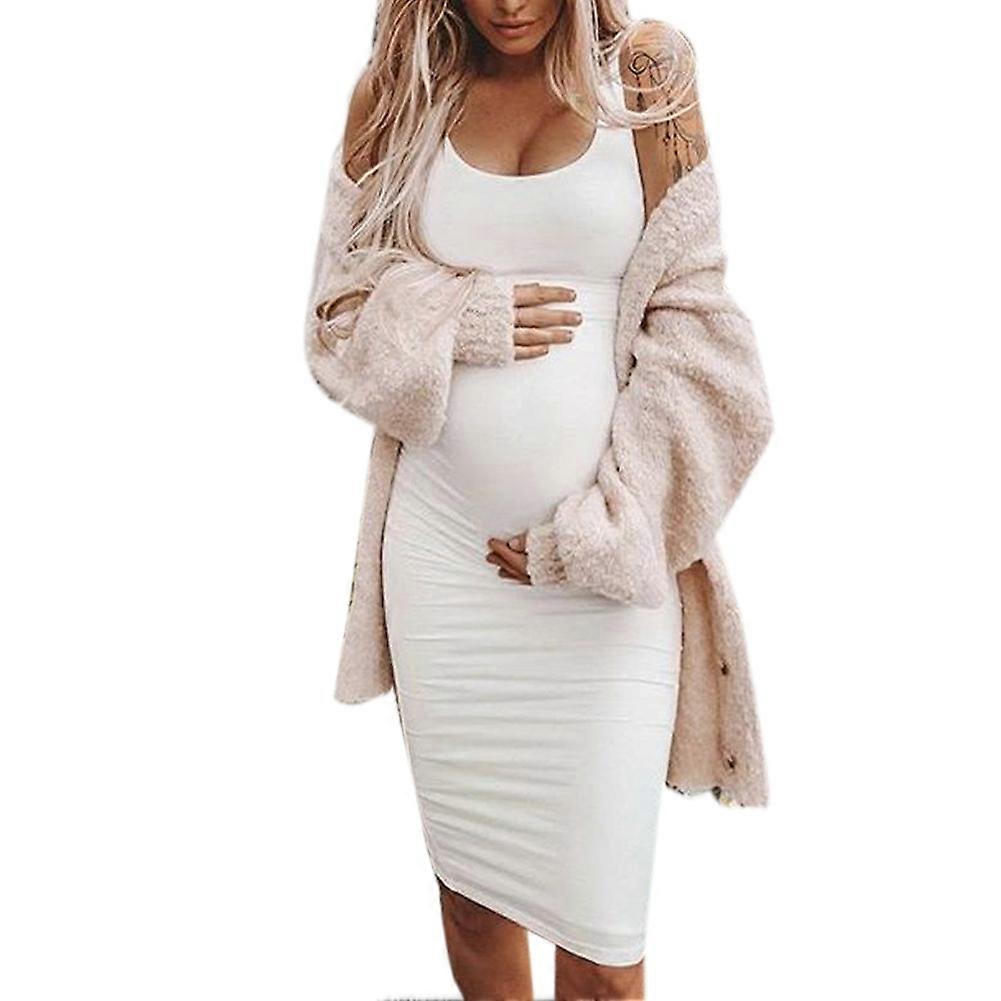 Women Simple Sleeveless Solid Color Loose Round Neck Maternity Dress (White S)