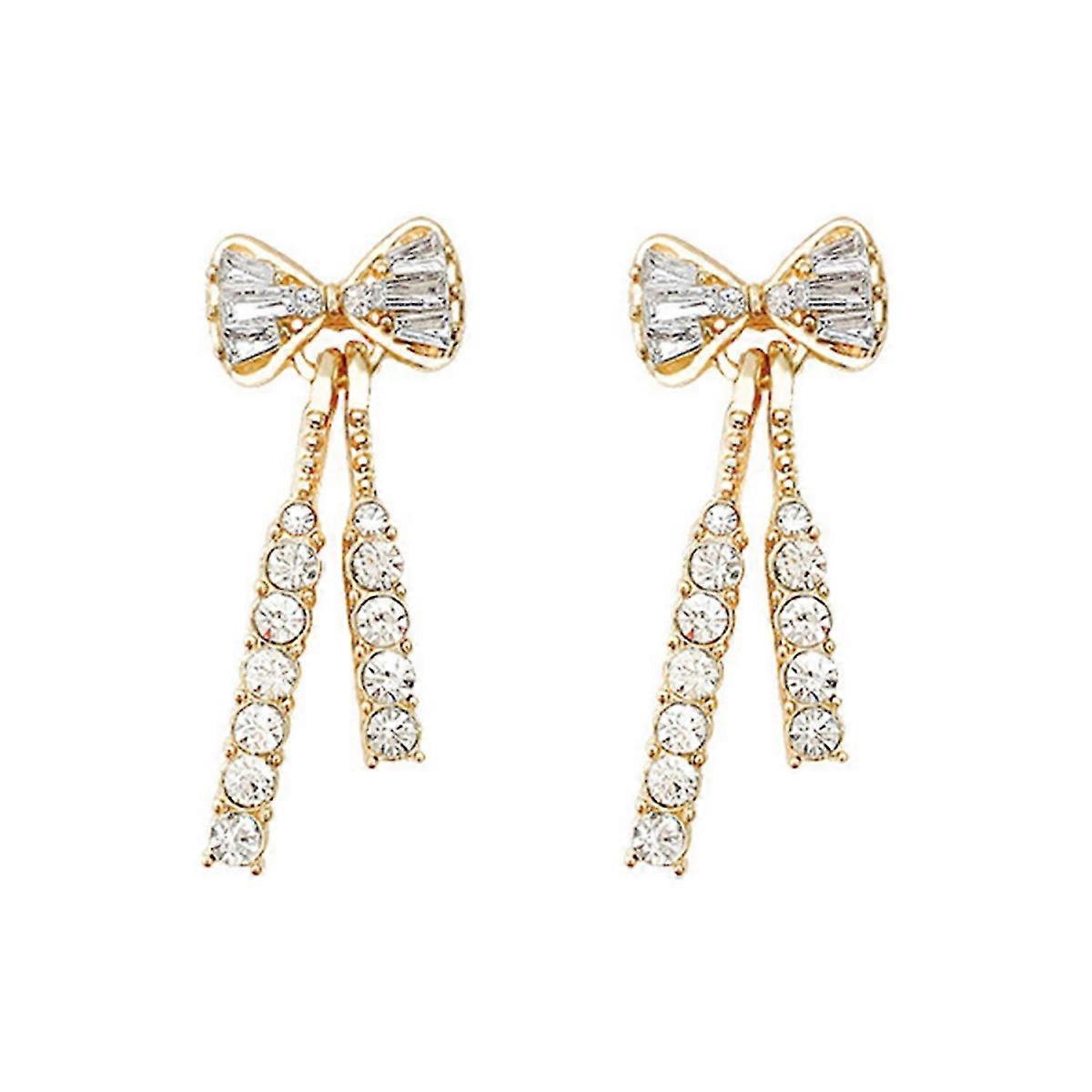 High-quality alloy and rhinestone materials for durability and elegance.<br> This pair of earrings is a great accessory to your dresses and everyday outfits as it is both luxurious and stylish.<br> These earrings feature long tassels, bowknot embellishments and sparkling studded rhinestones to make you look classy and stylish.<br> Stylish earrings are the best gifts for birthdays, wedding anniversaries, Valentine's Day, Christmas, Mother's Day and other special holidays.<br> This pendant earring is suitable for dates, banquets, daily wear and other occasions.<br> <br> Introducing our stunning drop earrings, the perfect accessory to elevate your style and make a statement. Crafted with high-quality alloy and adorned with sparkling rhinestones, these earrings exude elegance and sophistication.<br> The long tassels and bowknot embellishments add a touch of femininity, making them suitable for both formal occasions and everyday wear. Whether you're attending a special event or simply want to enhance your daily outfits, these stylish earrings are a must-have.<br> They also make for an ideal gift for birthdays, anniversaries, Valentine's Day, Christmas, Mother's Day, or any other special occasion.<br> From dates to banquets, these pendant earrings are versatile enough to complement any outfit and occasion.<br> Upgrade your jewelry collection with our exquisite drop earrings and let your style shine.<br> Item Name: Drop Earrings<br> Material: Alloy<br> Style: Elegant<br> Gender: Women<br> Processing Technology: Electroplating<br> Features: Bowknot Decor, Long Tassel, Sparkling Rhinestones<br> Size Details:<br> Size: 3.4cm x 1.4cm/1.34" x 0.55" (Approx.)<br> Notes:<br> Due to the light and screen setting difference, the item's color may be slightly different from the pictures.<br> Please allow slight dimension difference due to different manual measurement.<br> Package Includes:<br> 1 Pair of Drop Earrings
