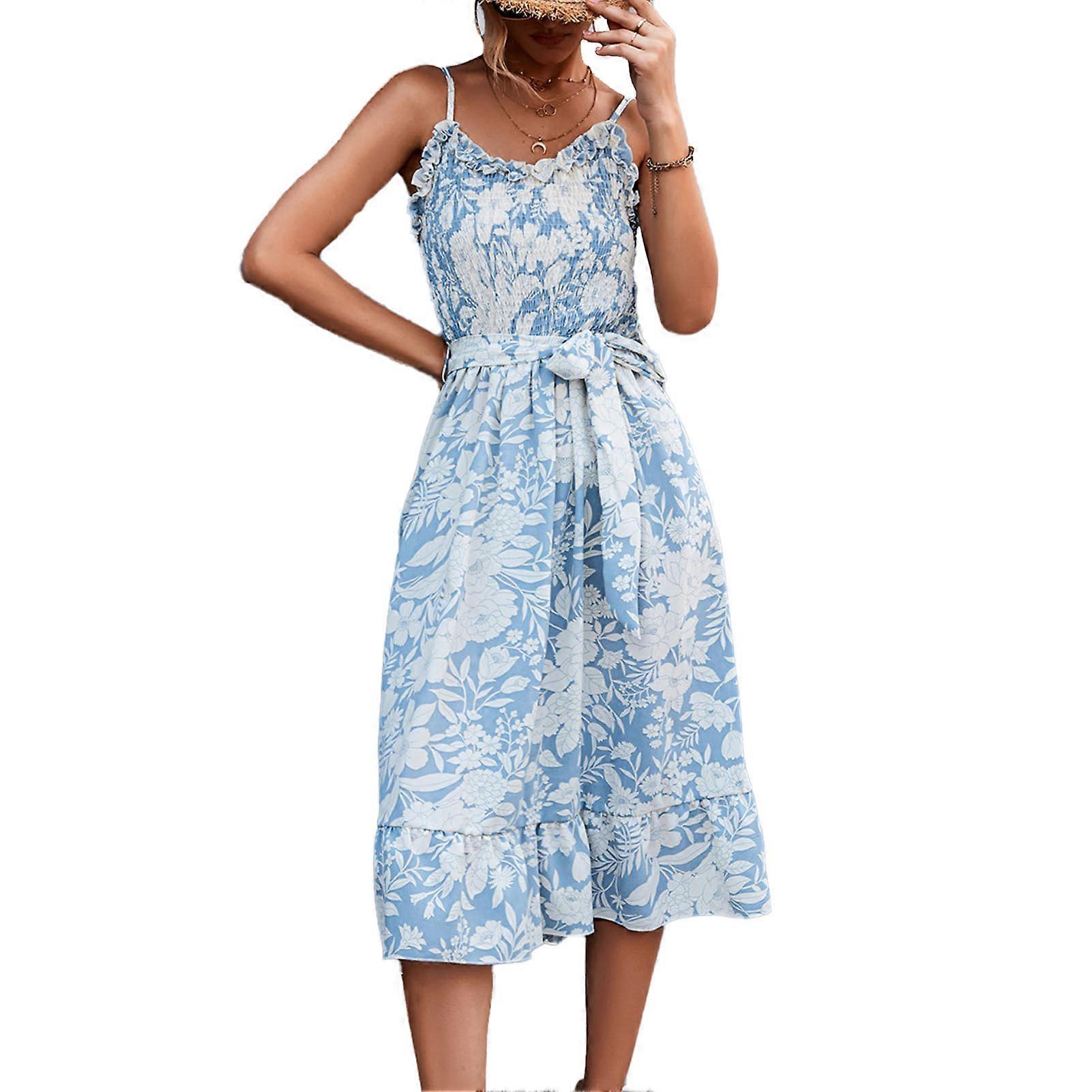 Women Spaghetti Strap Dress Shirred Frill Trim U Neck Belted Summer Sleeveless Floral Dress Light Blue M