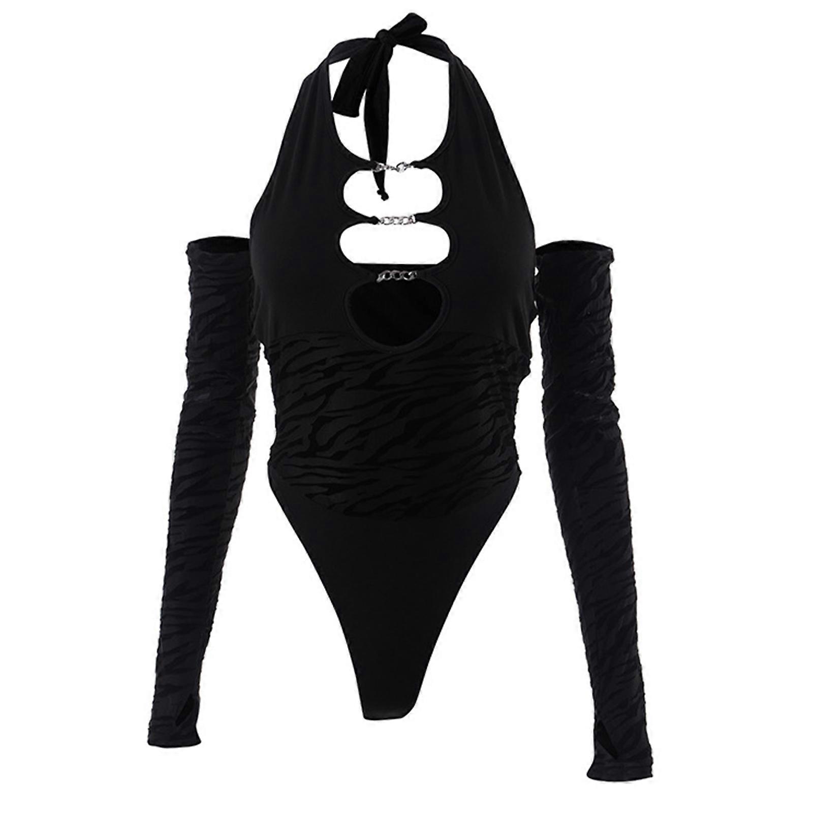Women Sexy Sheer Mesh Sleeveless Halter Bodysuit Cutout Front Backless Jumpsuits Skinny Leotard Top with Oversleeve Black S