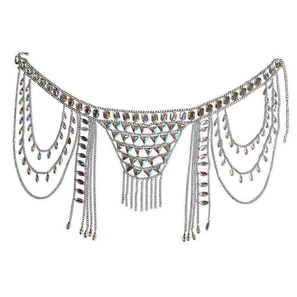 Women Sexy Suit Body Chain Boho Holographic Diamond for Rhinestone Bra Top Waist Belly Tassel Skirt Summer Bikini Jewelry Dancing Party Beach Costume