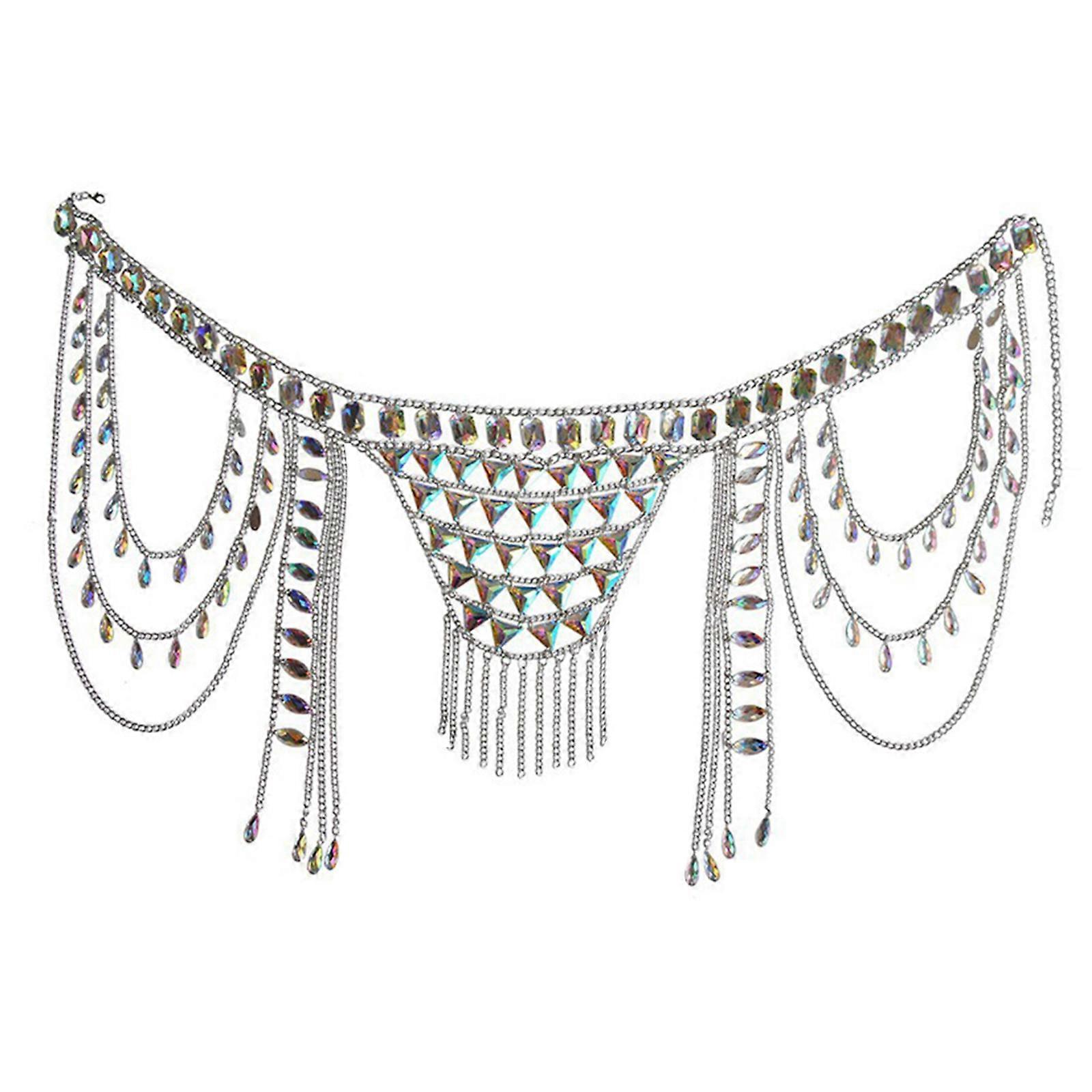 Women Sexy Suit Body Chain Boho Holographic Diamond for Rhinestone Bra Top Waist Belly Tassel Skirt Summer Bikini Jewelry Dancing Party Beach Costume