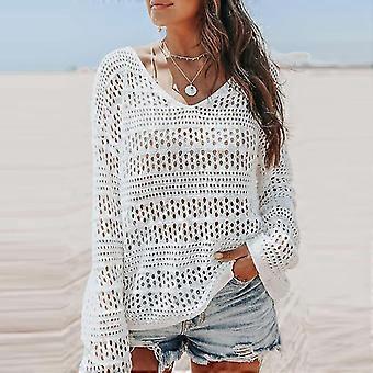Women Solid Color Swimsuit Coverup V Neck Lace Crochet Bikini Beachwear Knitwear Top