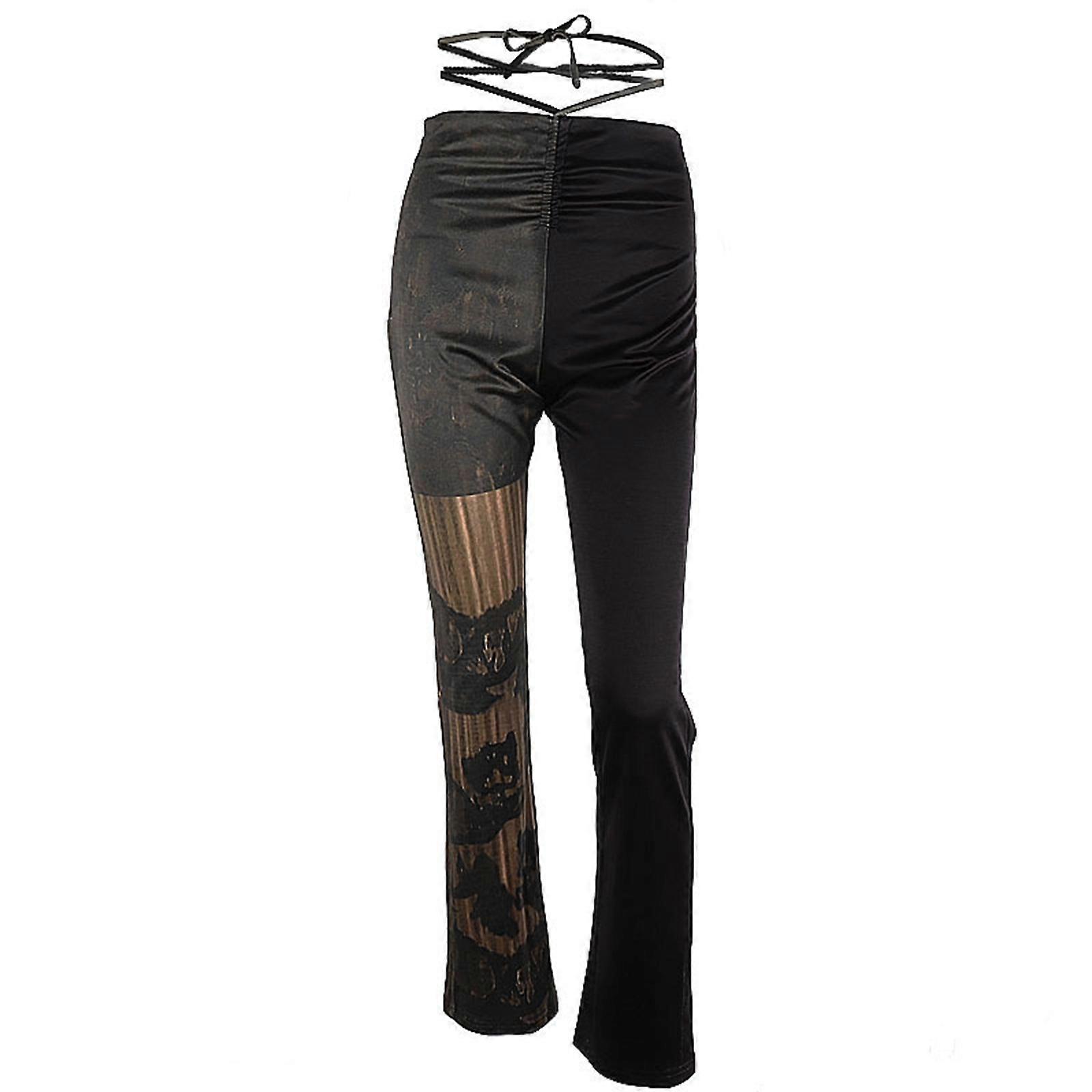 Women Dark Goth Punk High Waisted Slim Fit Straight Pants with Lace-Up Drawstring Harajuku Colorblock Graphic Trousers M