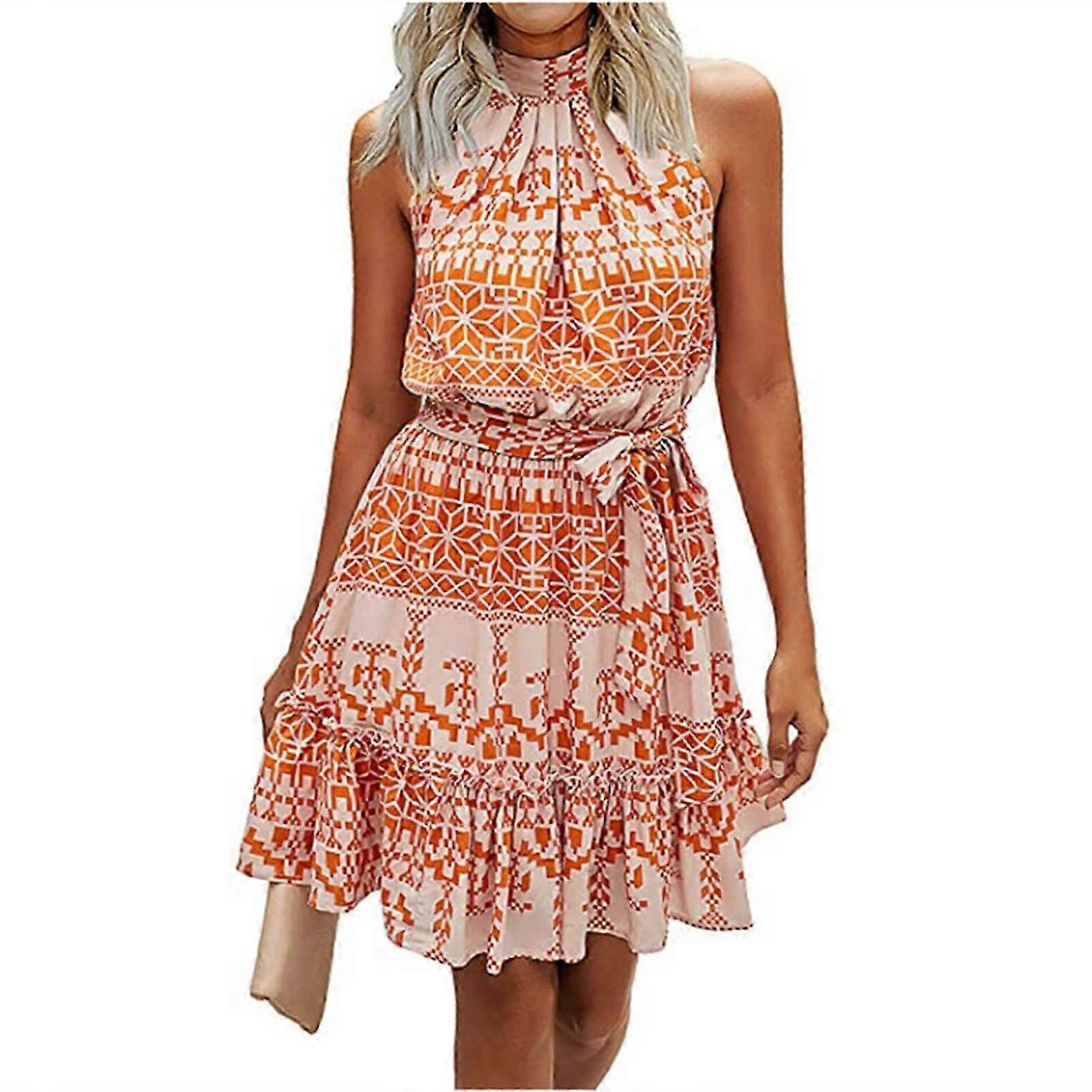 Women Sleeveless Halter Neck Floral Print Knee Length Dress with Elastic Waist for Casual Wear Apricot Print Summer Dress
