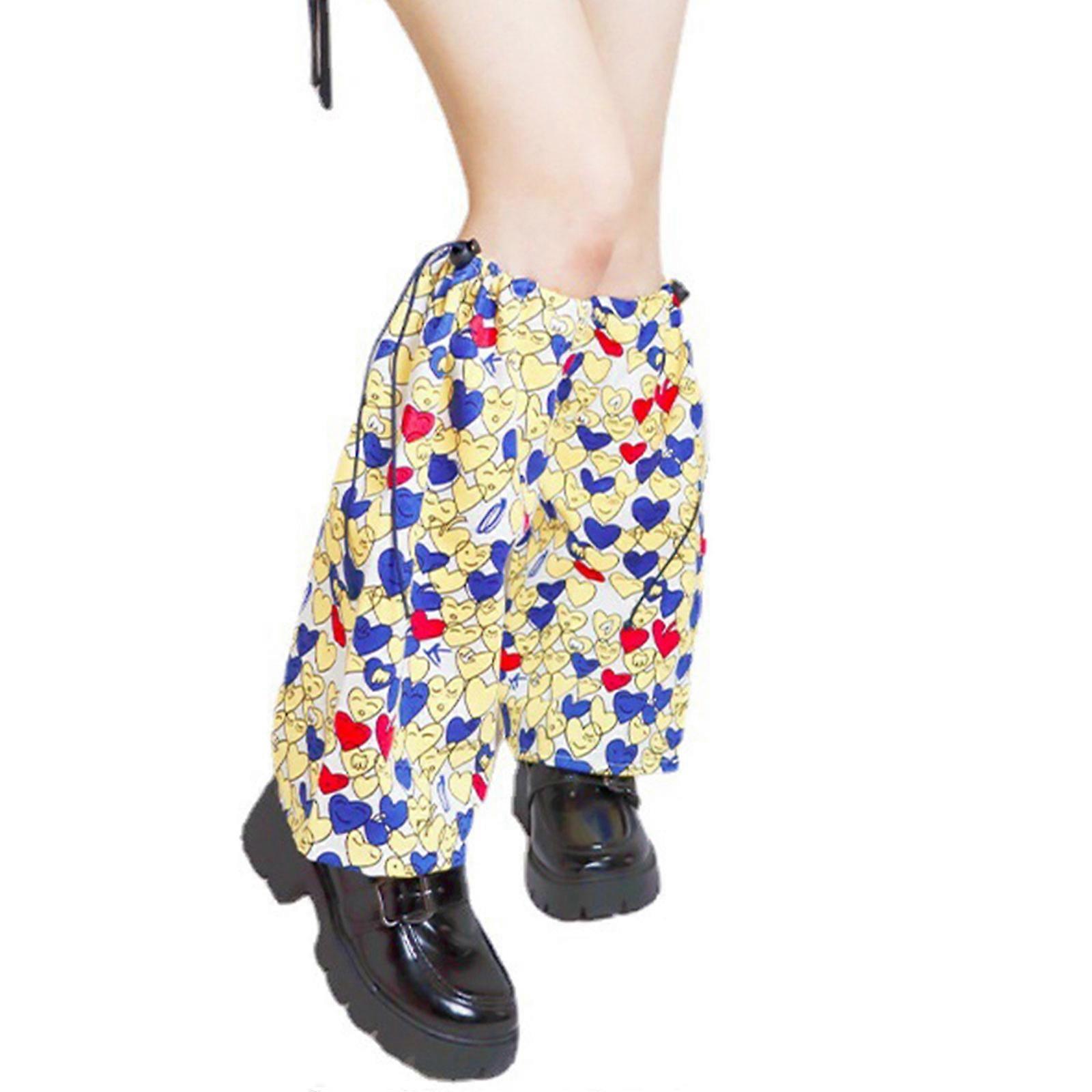 Women Punk Leg Warmers Japanese Harajuku Multicolor Cartoon Smile Heart Print Foot Cover Baggy Drawstring Knee High Sock Black