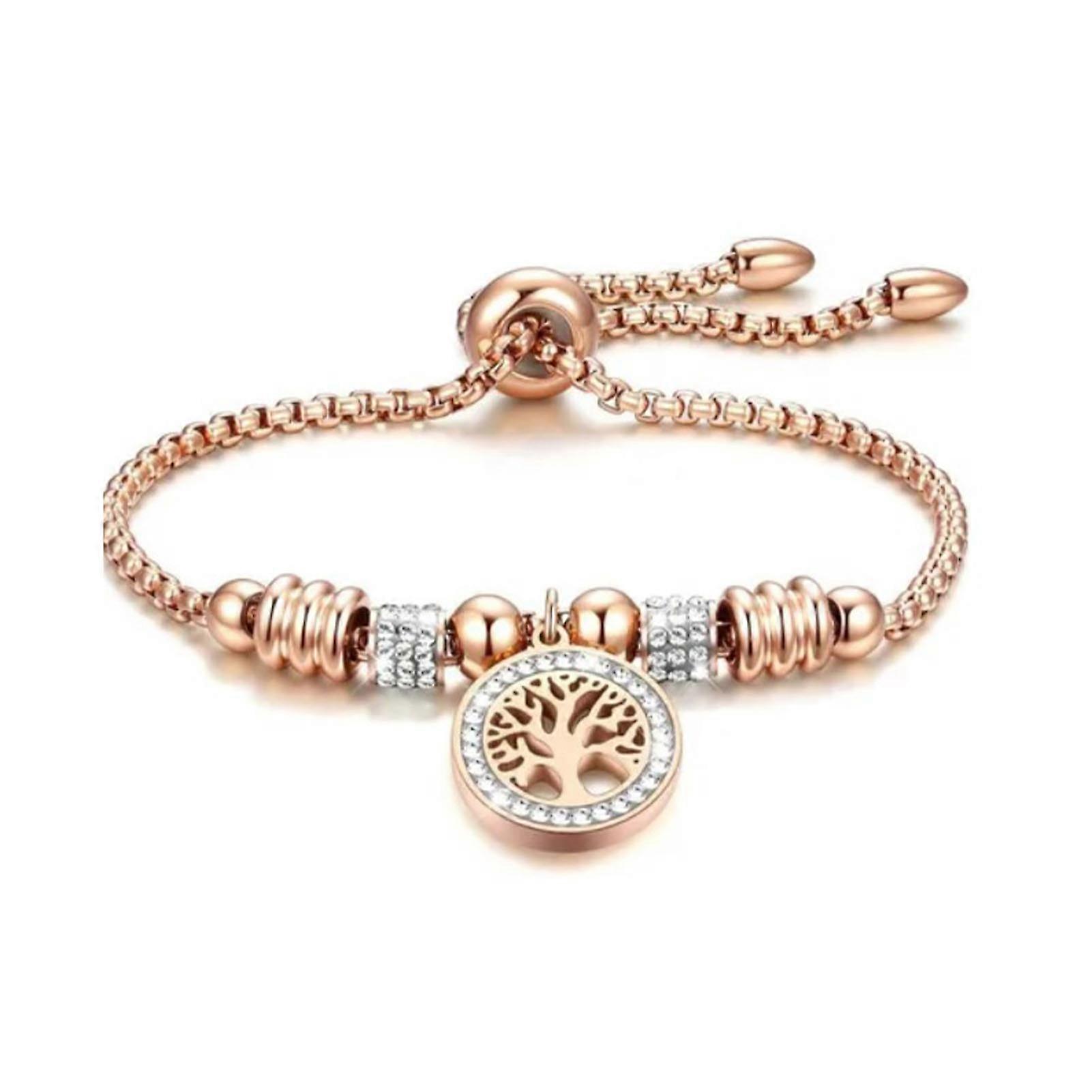 Women Bracelet Stainless Steel Rhinestone Adjustable Hollow Tree Fashionable Jewelry Rose Gold
