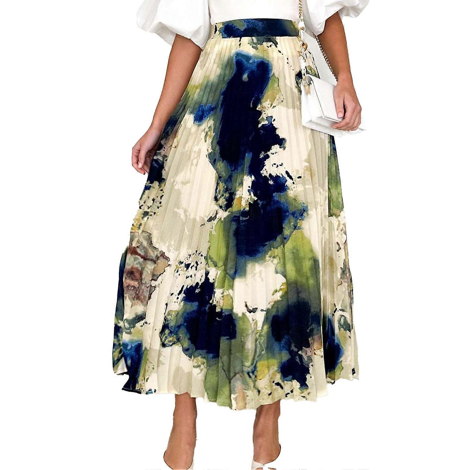 Women Pleated A Line Long Skirt Floral Print Flowy Elegant Casual Elastic High Waist Maxi Skirt