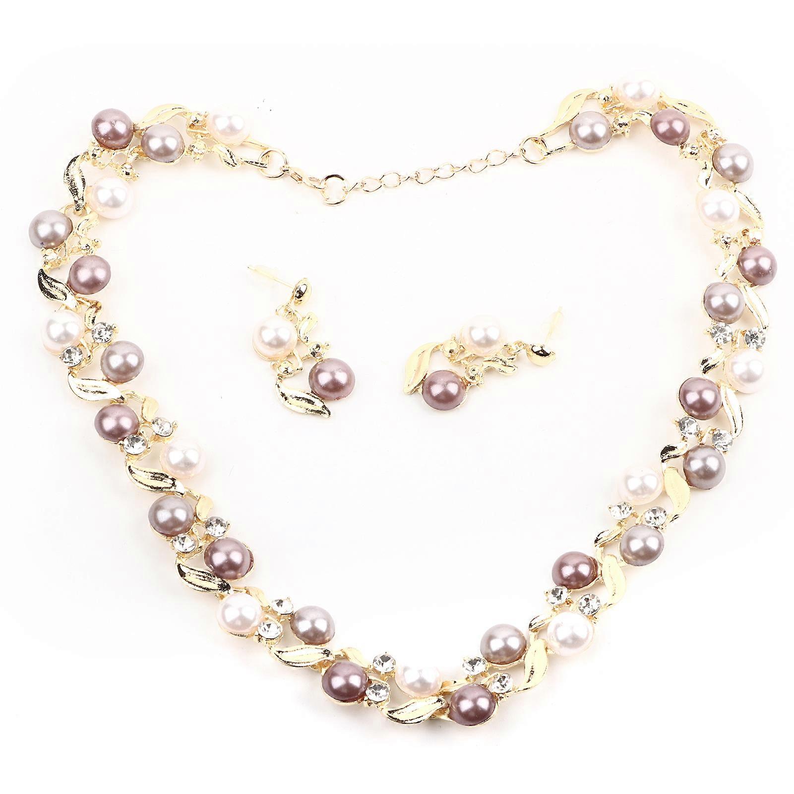 Women Faux Pearl Necklace Earrings Set Bridal Jewelry Set with Rhinestone(Gold)
