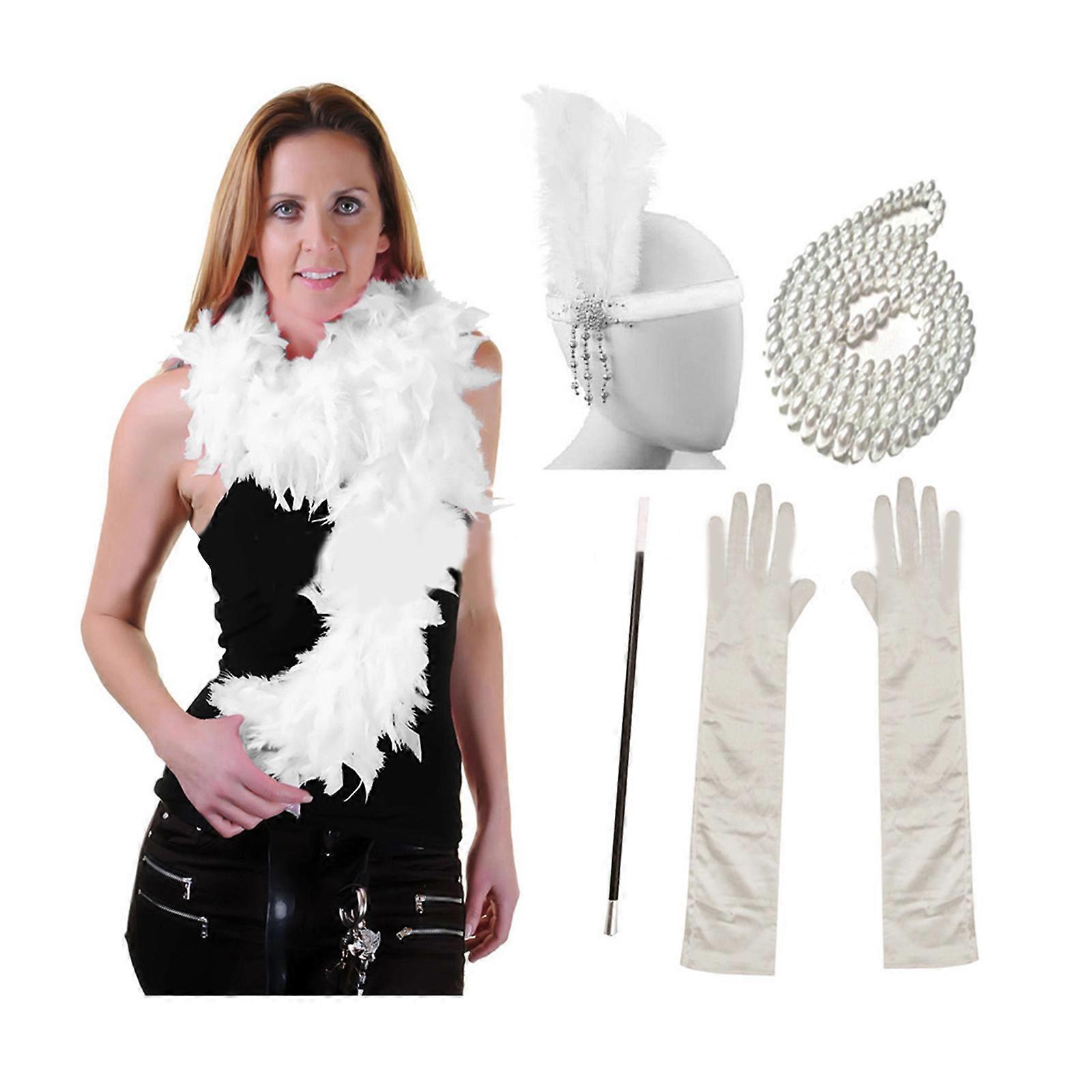 Women Flapper Accessories Gatsby Party Costume Set Feather Headband Necklace Satin-Gloves Scarf for Cocktail Party Prom White