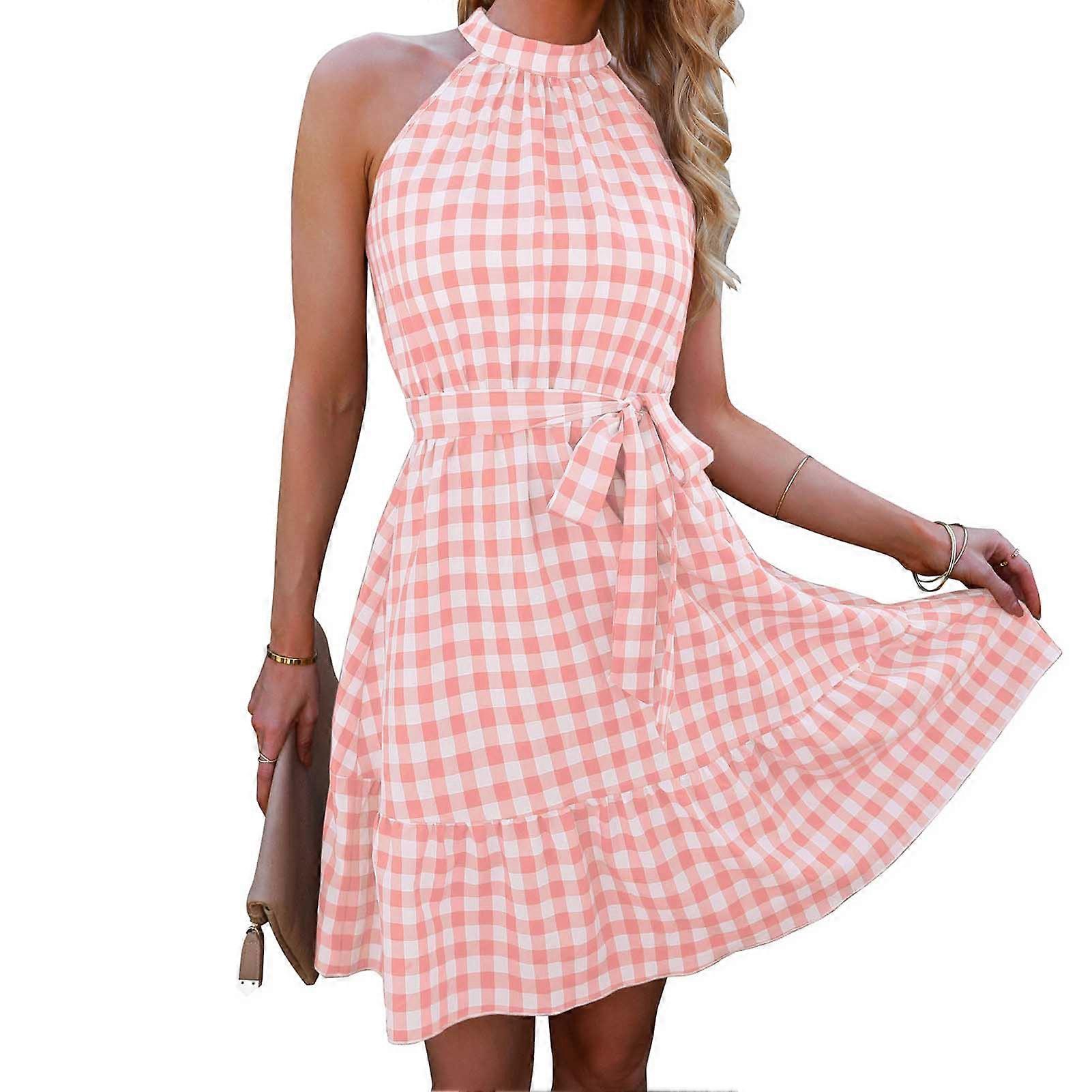 Women Halter Neck Sleeveless Plaid Dress One Piece Ruffle Flowy Hem Key Hole Back High Waist Line with Belt Pink S
