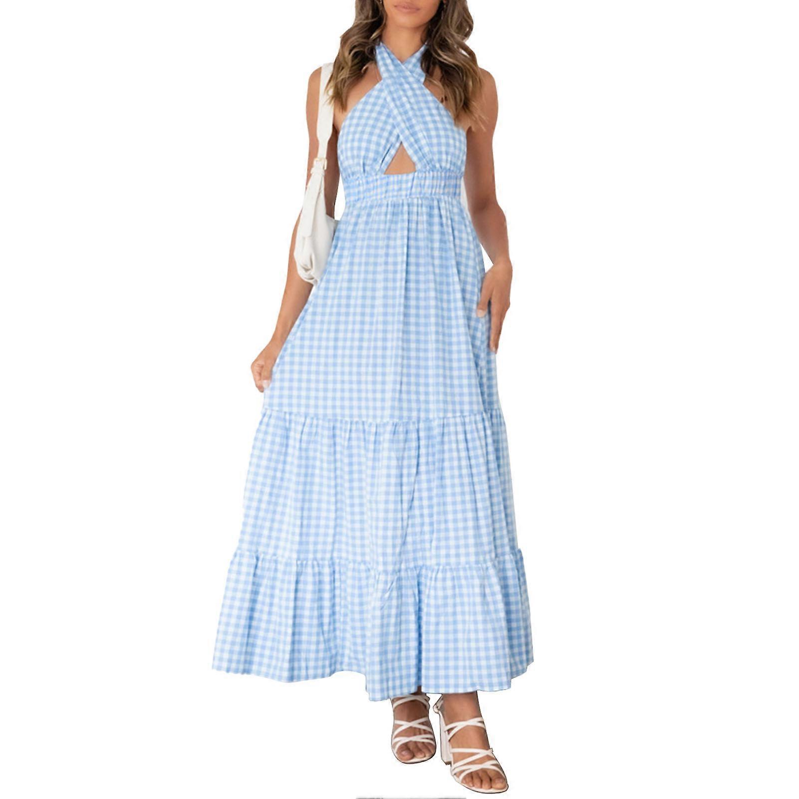 Women Halter Neck Backless Sleeveless Plaid Long Dress Elastic High Waist Ruffle Flowy Hem for Holidays Clubs Dates Blue XXL