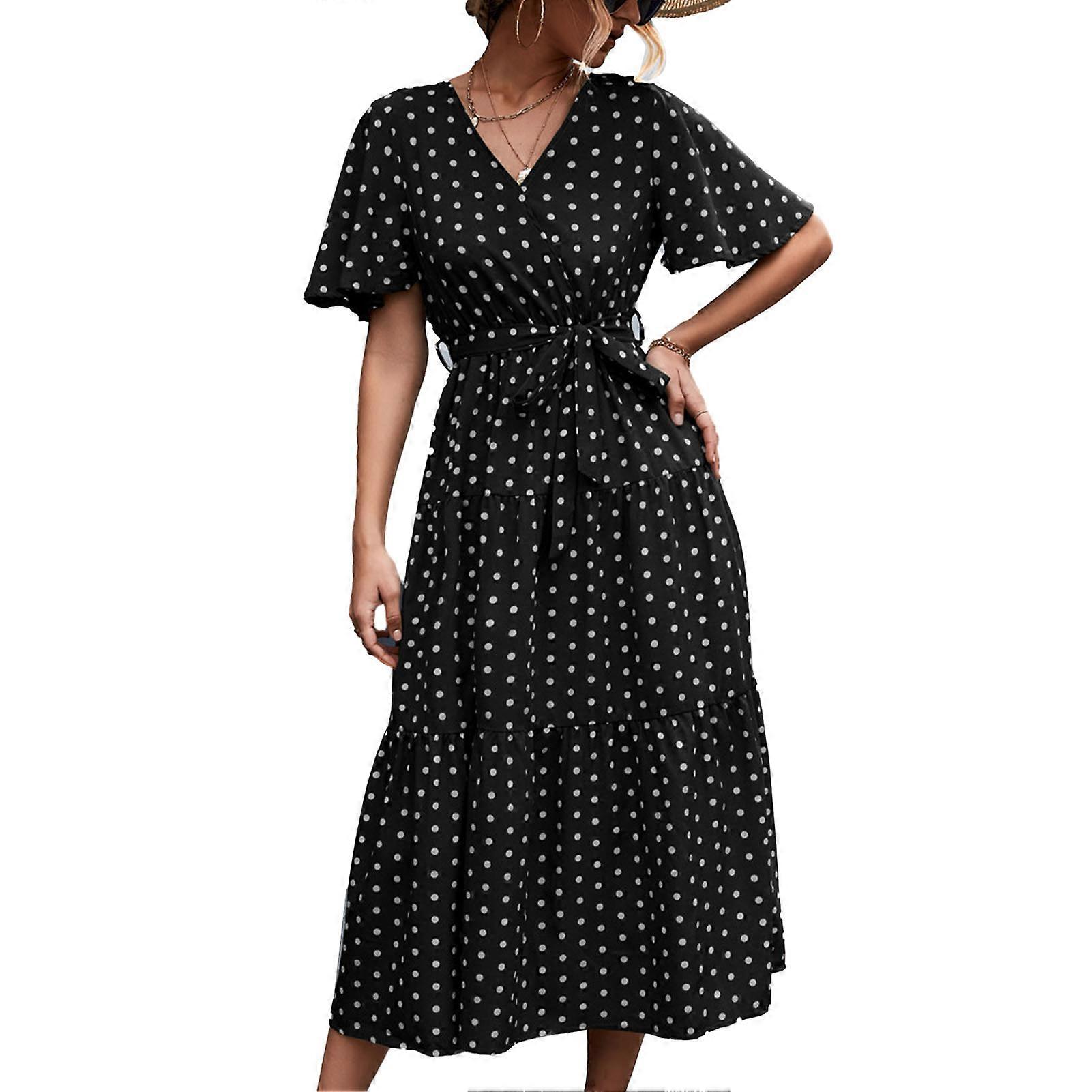 Women Wrap V Neck Dress Short Sleeve Waist Belted Breathable Summer Maxi Dress for Daily Wear Black White Dots L